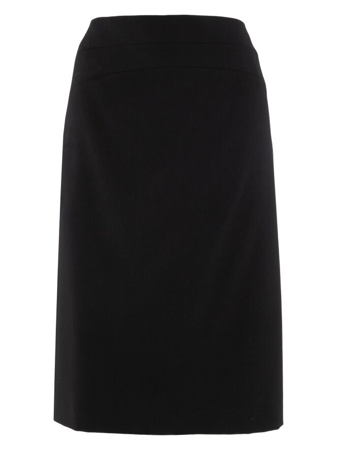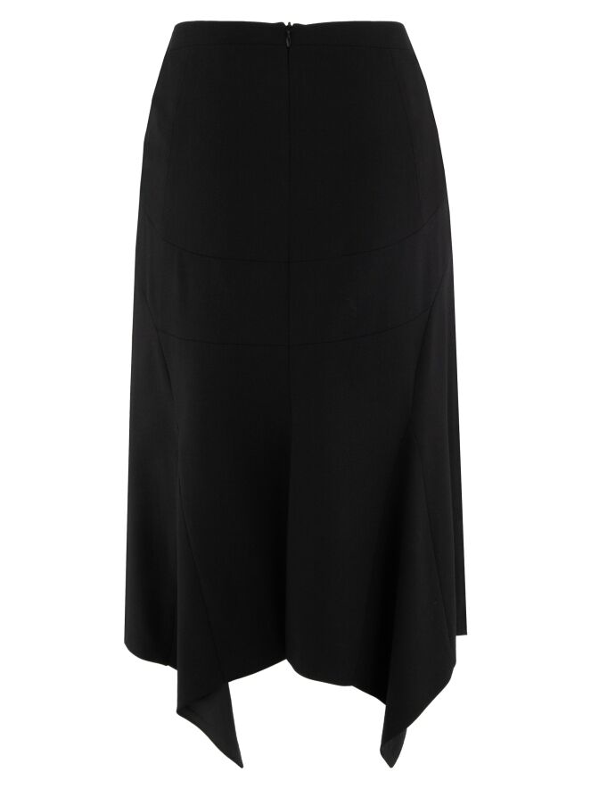 Een rok van Clasen in de kleur zwart. Aan de achterkant, ter hoogte van de heupen, zijn twee rond gestikte naden, en vanaf deze stiknaden lopen twee plooien. De rok is gevoerd en mag met de hand gewassen worden.