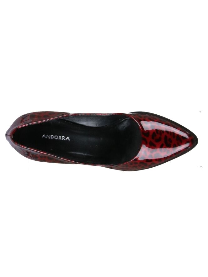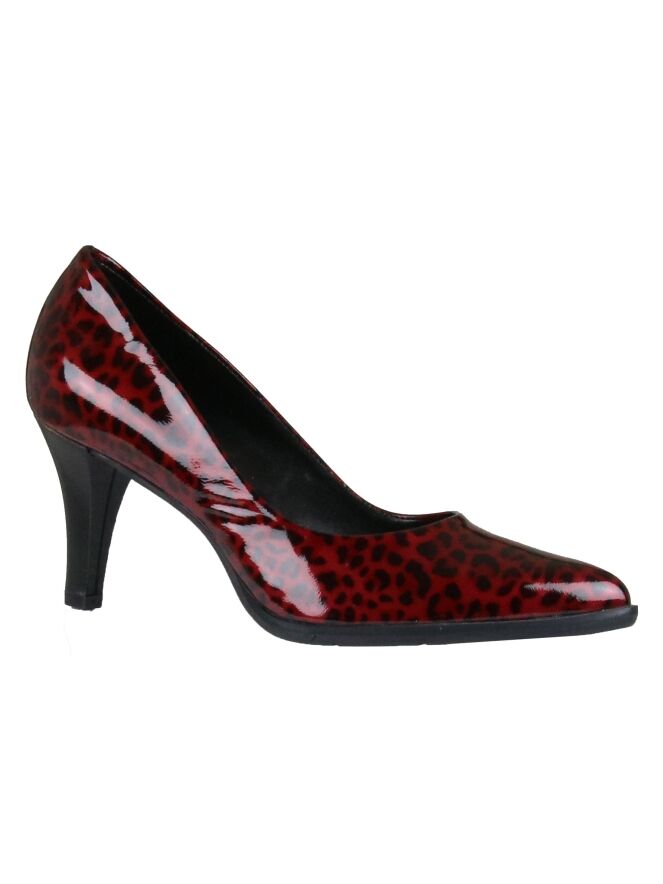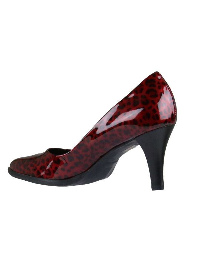 Een pumpje van Cristian Daniël in een panterprint met de kleuren rood en zwart. Het materiaal is van lakleder. Het hakje is elegant en slank. Het pumpje heeft een lederen binnenvoering.