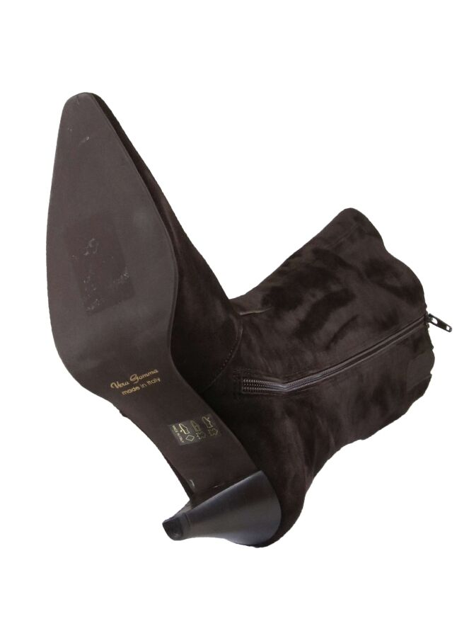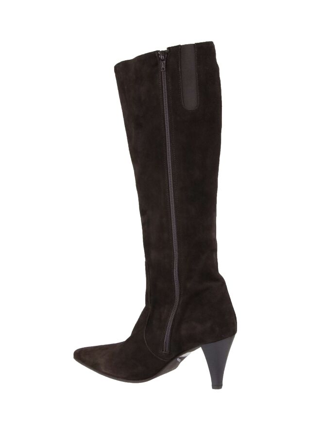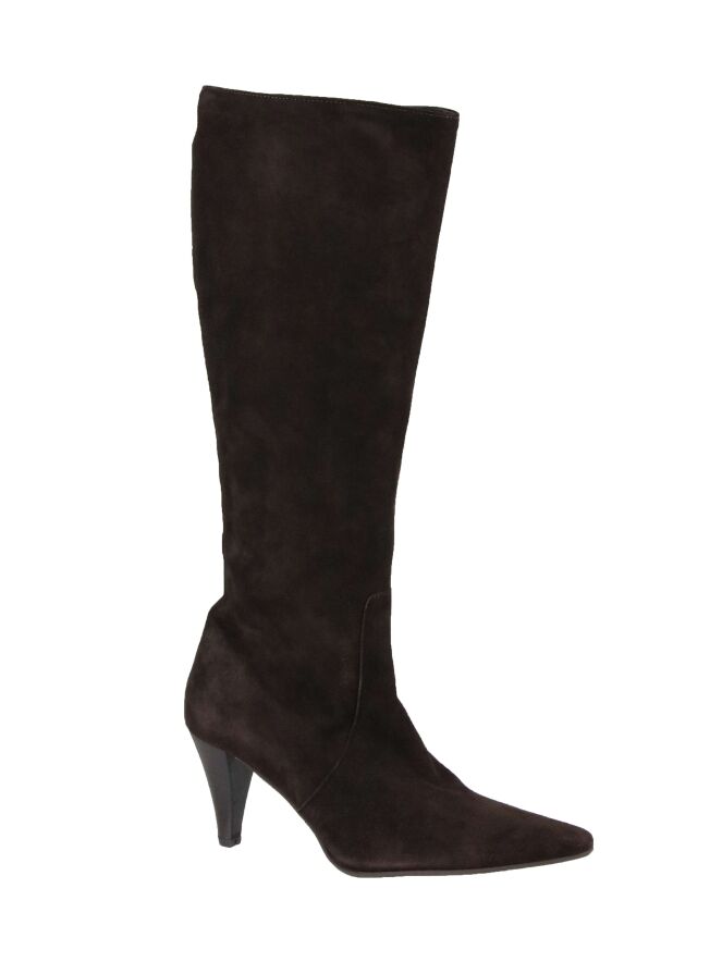 Een laars van Cristian Daniel in de kleur mokka bruin. De laars heeft een spitse neus en een elegante hak. Aan de binnenzijde is een rits. In de rand van de schacht is bij de rits een stuk elastiek.