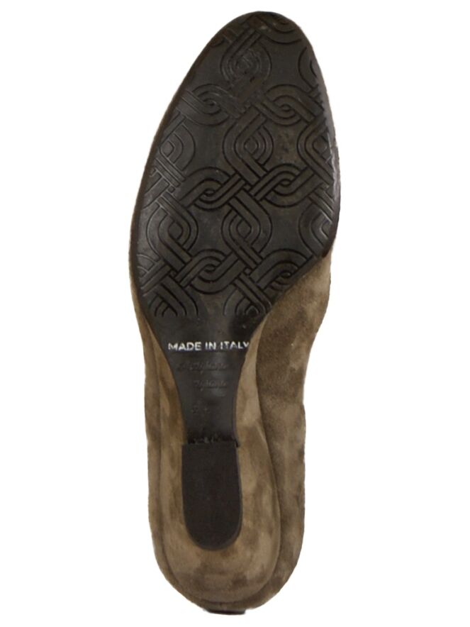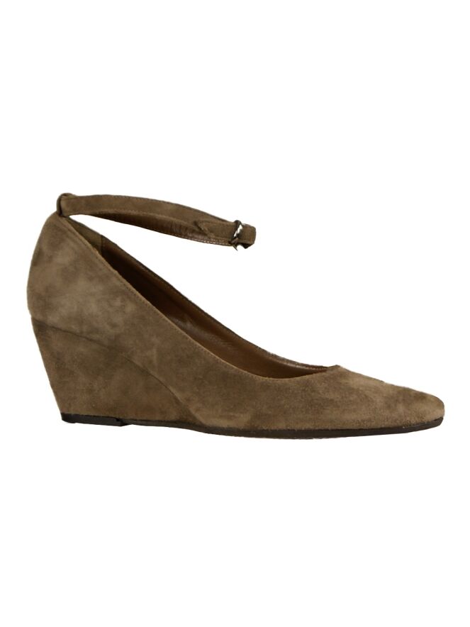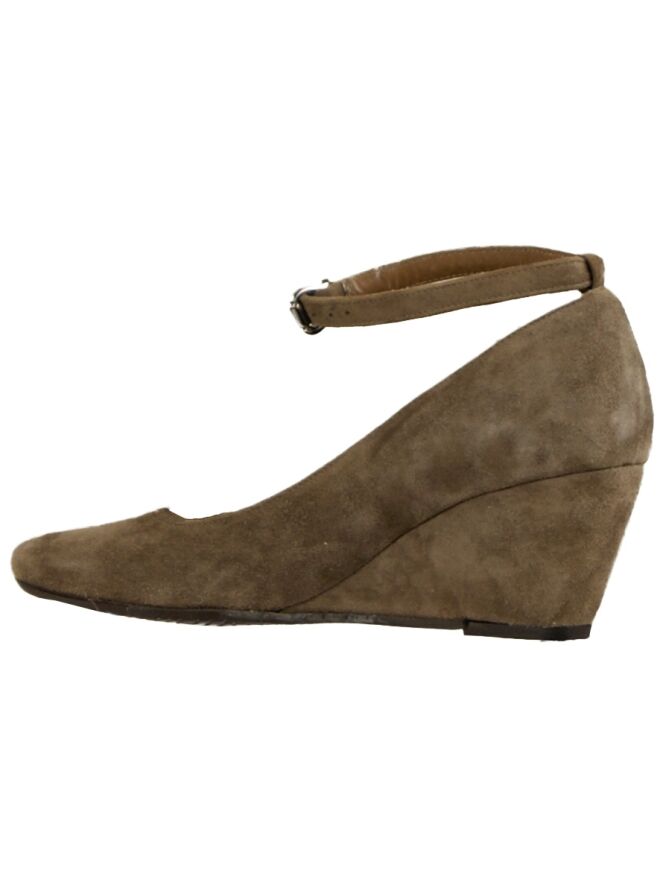 Een pump op een sleehak van het merk Cristian Daniel in de kleur taupe. Aan de hiel is een enkelbandje bevestigd. De pump heeft een ronde neus en is aan de binnenkant met leder gevoerd.