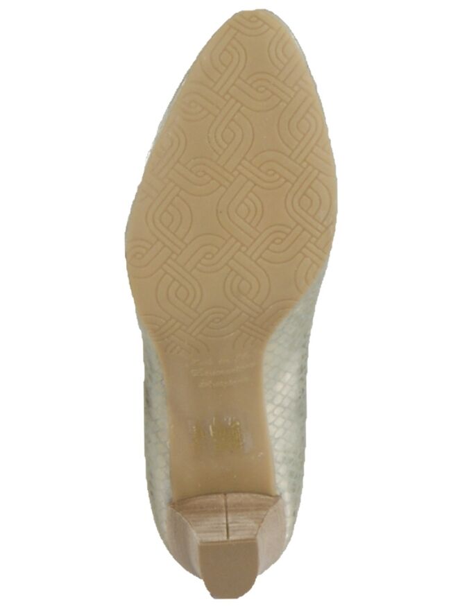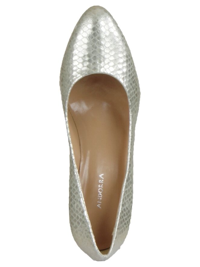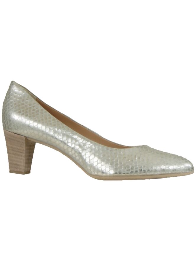 Deze pump is uitgevoerd in een parelmoer zilveren kleur in een reptiel print. De pump heeft een hakje in een neutrale houtkleur en is slank gesneden met een hak breedte van 2,5 cm. De binnenvoering is van leder en deze pump heeft een mooie ronde neus.