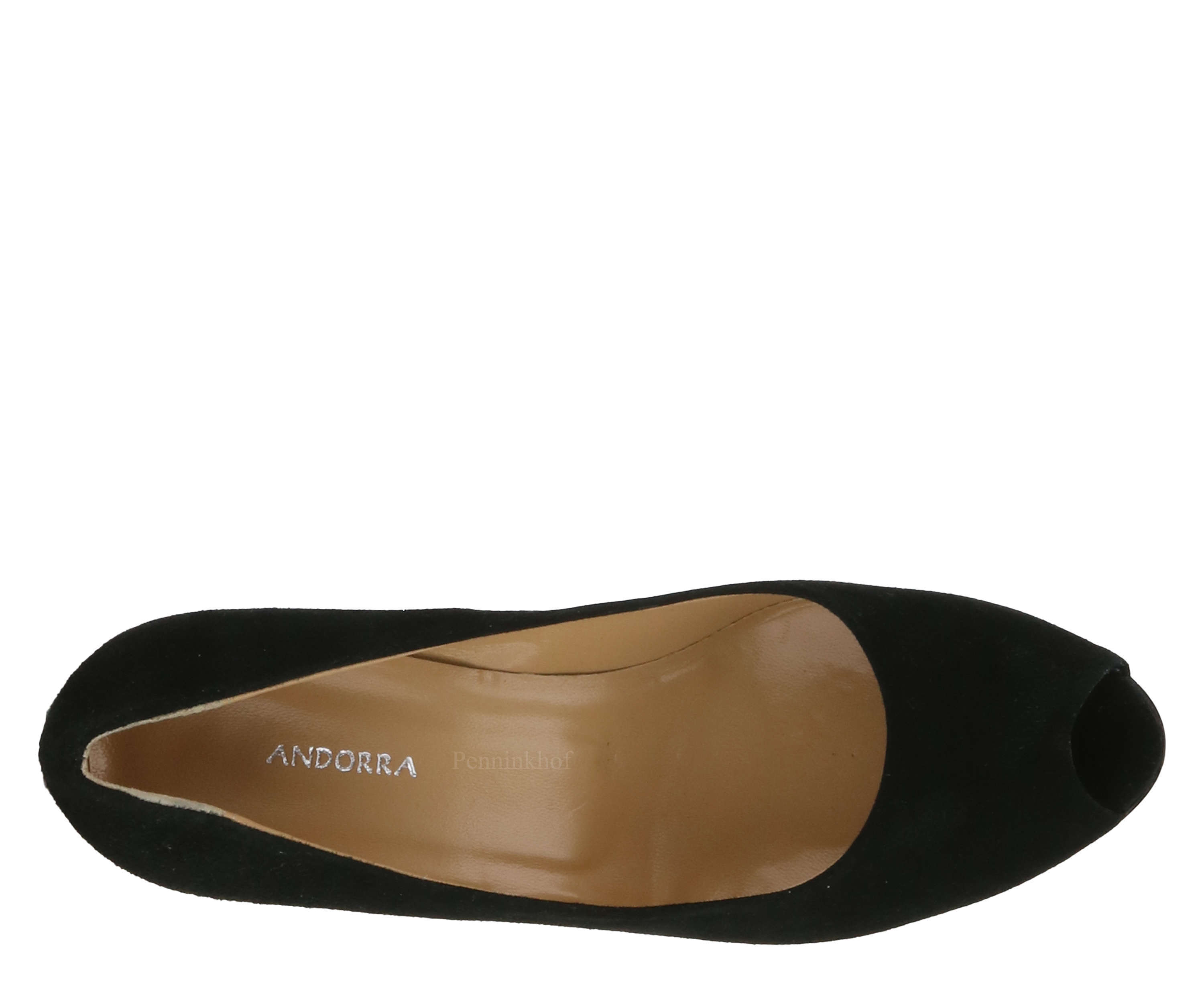 Een pump van Cristian Daniel in de kleur zwart. De pump heeft een open teen en de plateauzool is bekleed in hetzelfde suède als de pump. De hak is in een houtkleur en de binnenkant is met leder gevoerd.