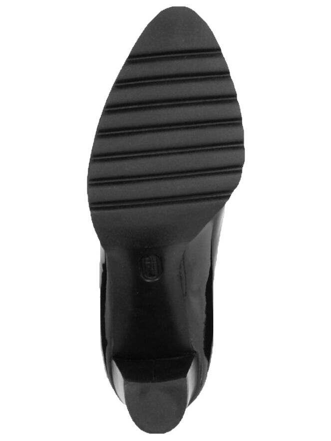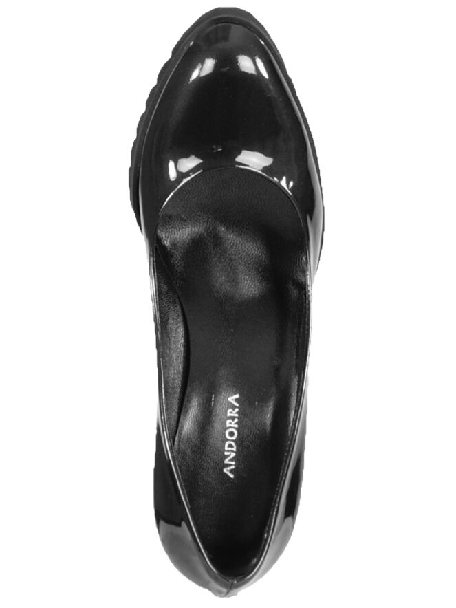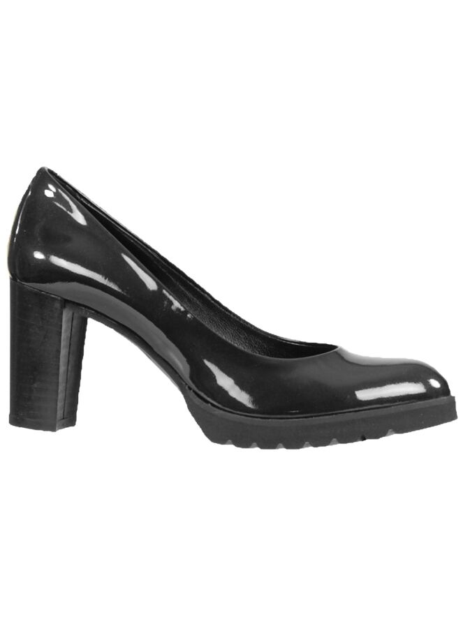 Een pump in het lak leder van het merk Cristian Daniel in de kleur zwart. De pump heeft een ronde neus en een gekartelde zool. De pump heeft een blokhak en de binnenkant van de pump is met leder gevoerd.