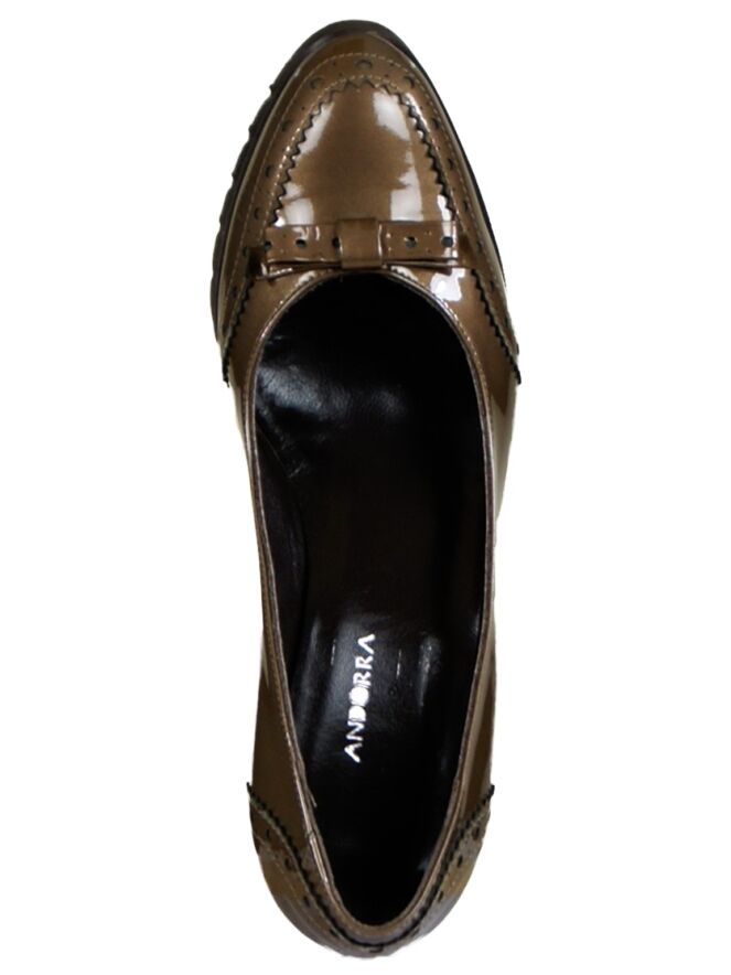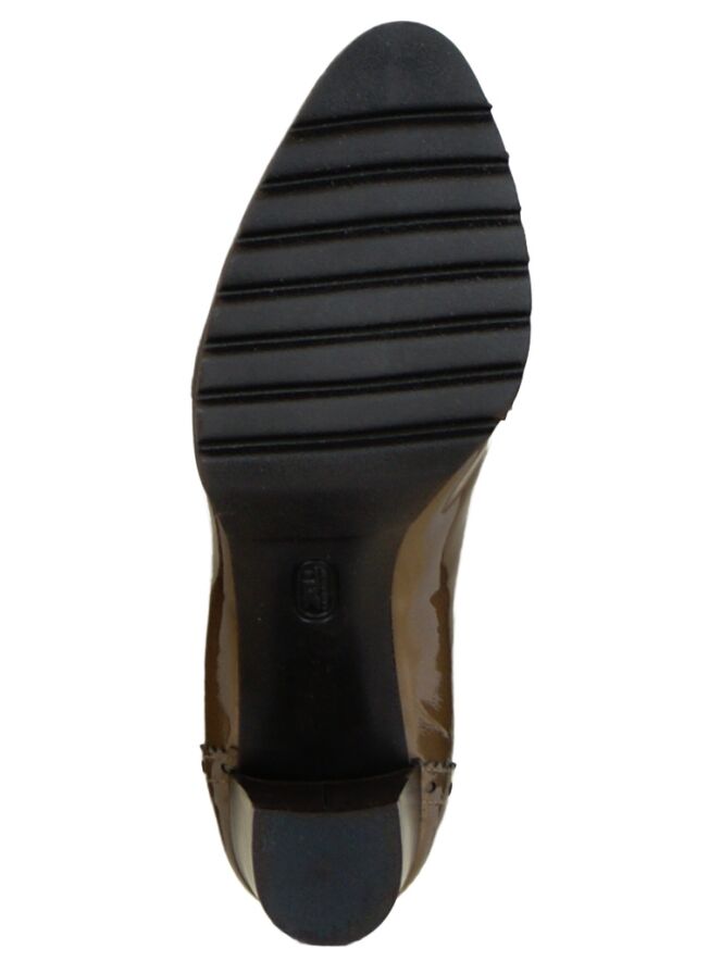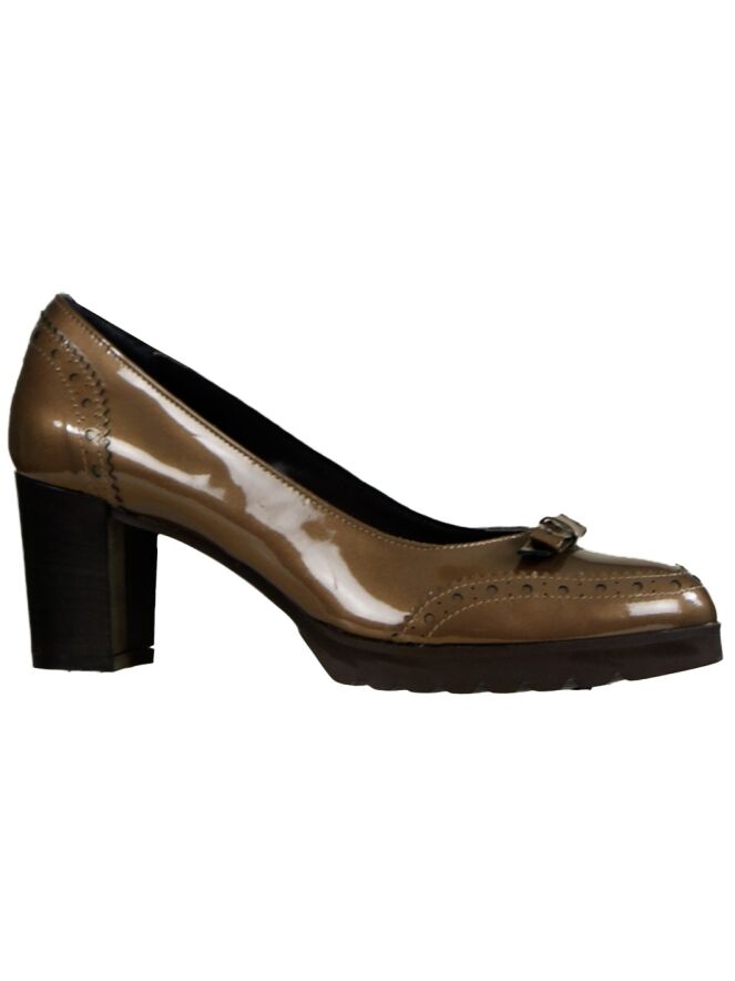 Een pump in het lak leder van het merk Cristian Daniel in de kleur bruin. Het is een brooks model met een ronde neus en een strikje op de voorvoet. De pump heeft een blokhak en heeft een gekartelde zool. De binnenkant van de pump is met leder gevoerd.