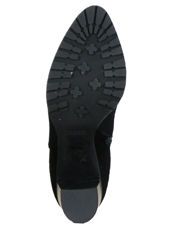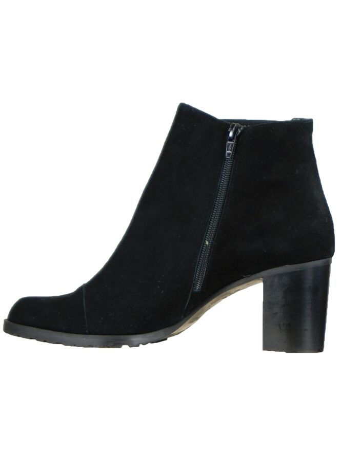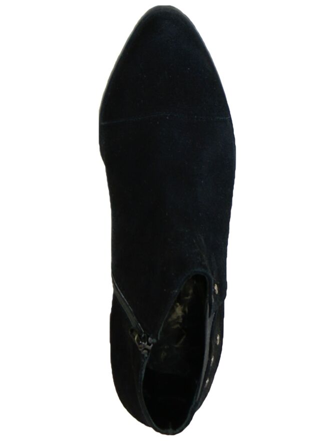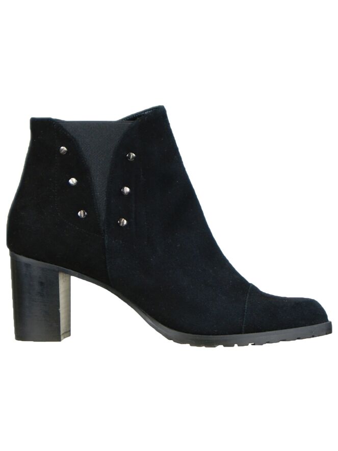 Een enkellaarsje van Cristian Daniël in een zwart suède. Aan de buitenzijde van het laarsje is een elastieken stuk ingezet in een V vorm waar langs mat nikkelen studjes zijn gezet. De zool is gekarteld. Op het neusje is een stiknaadje overdwars gemaakt.