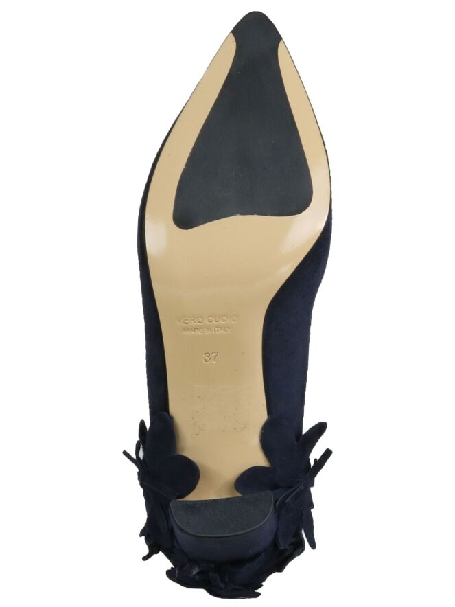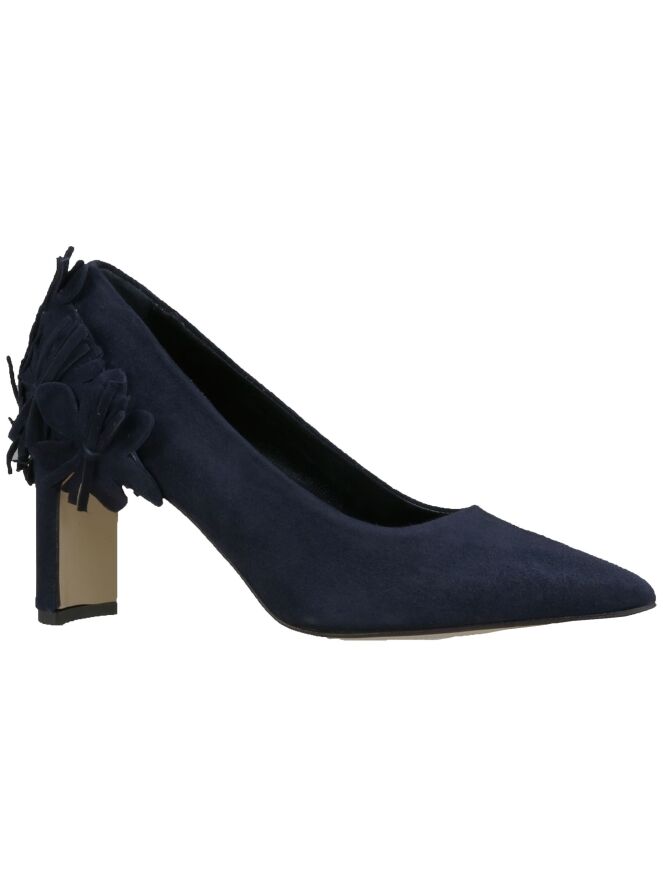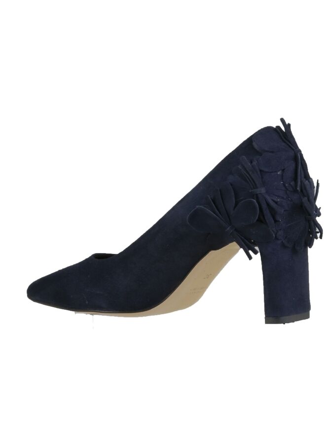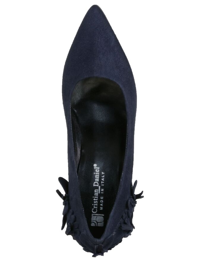 Een pump van het merk Cristian Daniel in de kleur nachtblauw. De pump heeft een spitse neus en heeft op de hiel een decoratie van bloemen met franjes in suède. De elegante hak is bekleed in suède. De binnenkant is met leder gevoerd.