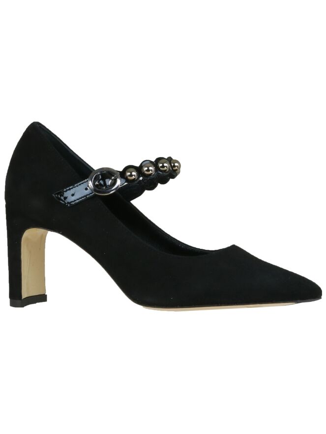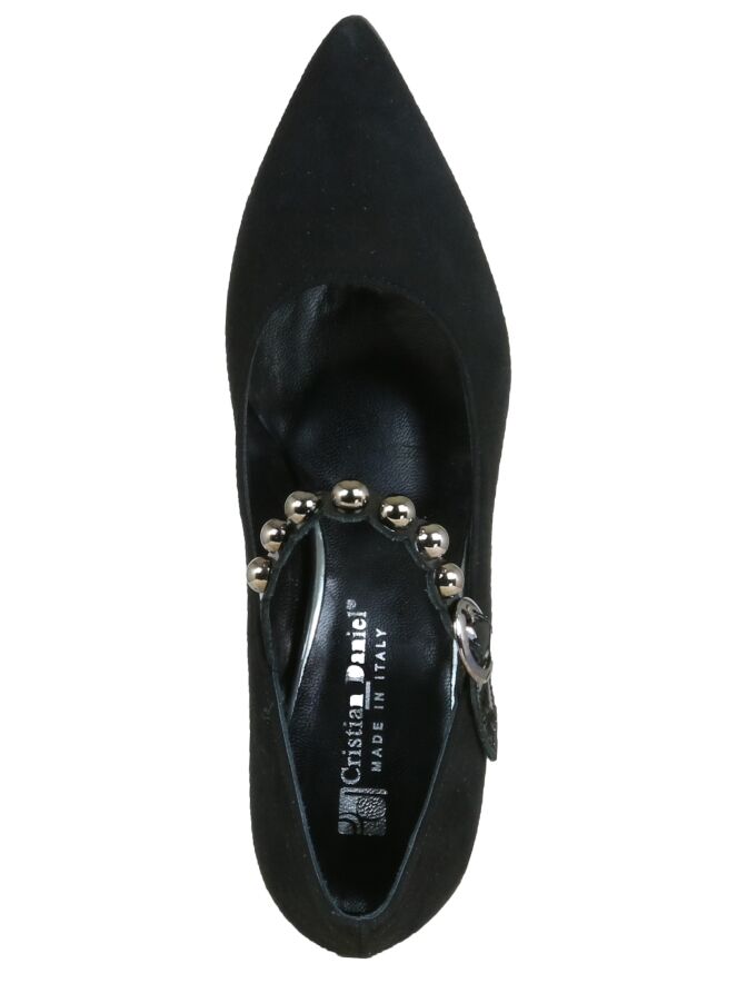 Een pump van het merk Cristian Daniel in de kleur zwart. De pump heeft een spitse neus en heeft over de voorvoet een smalle bies in lakleder met ronde zilver kleurige studs. De elegante hak is bekleed in suède. De binnenkant is met leder gevoerd.