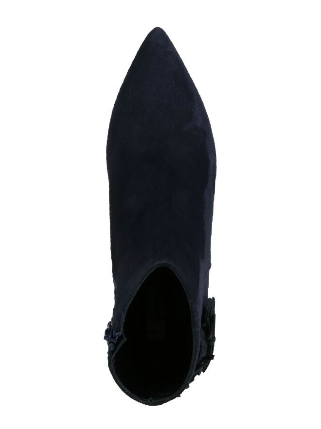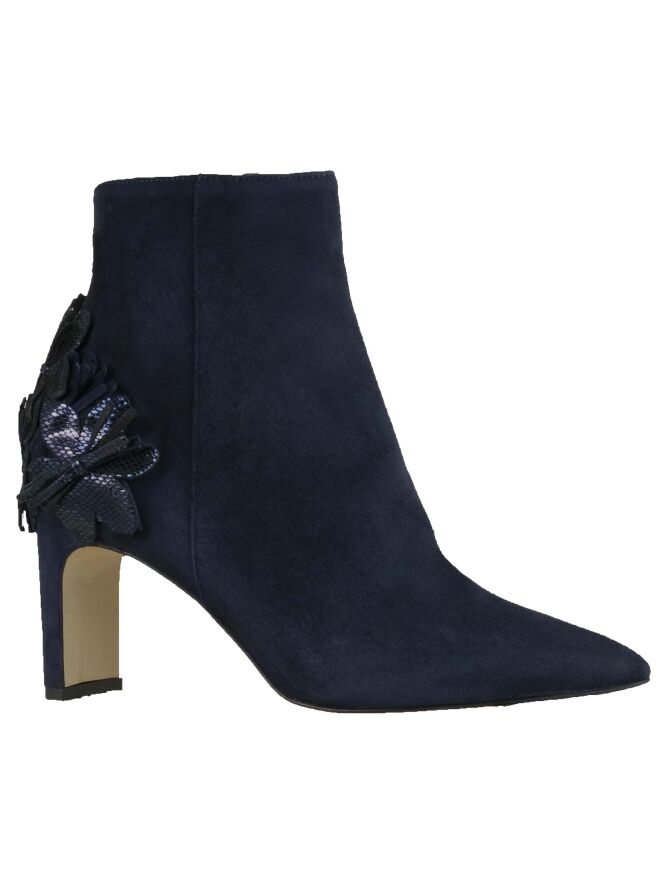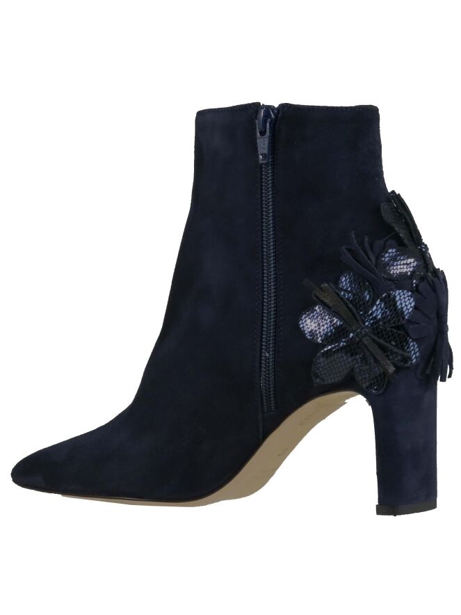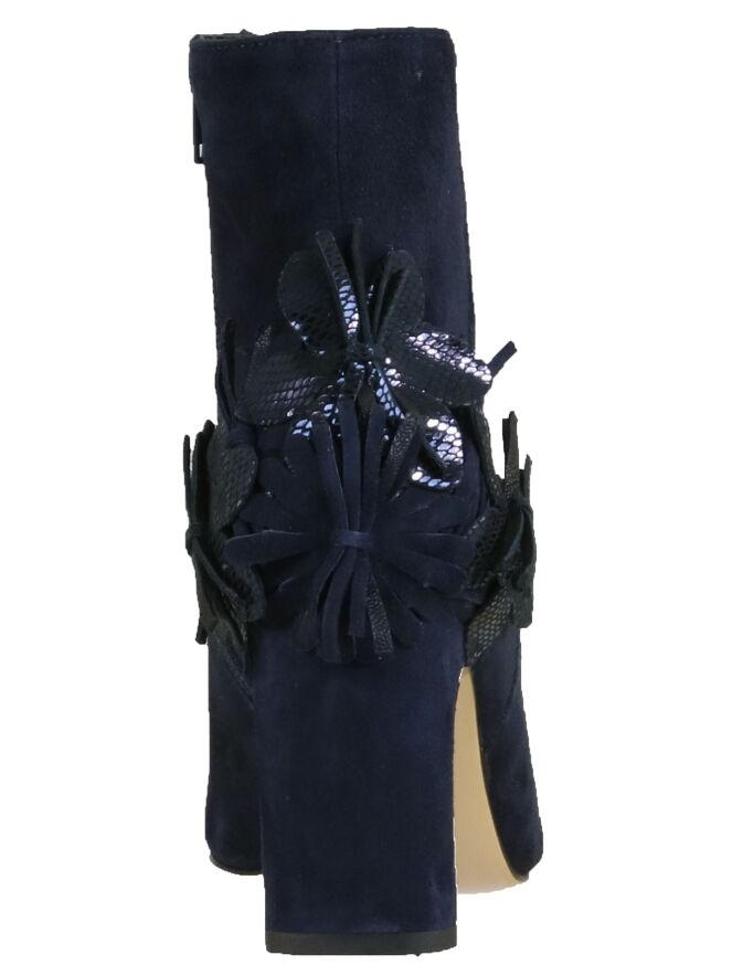 Een enkellaarsje van het merk Cristian Daniel in de kleur nachtblauw. Het laarsje heeft een spitse neus en heeft op de hiel een decoratie van bloemen met franjes in leder met een wafelprint. De elegante hak is bekleed in suède. De binnenkant is met leder gevoerd.