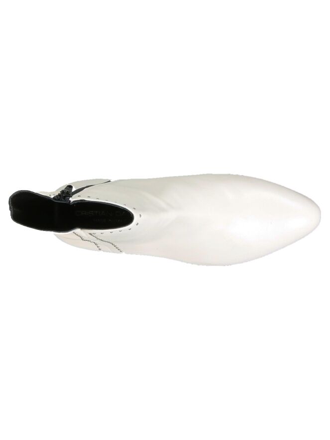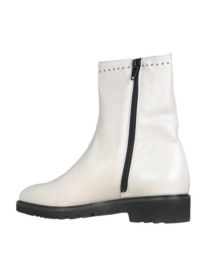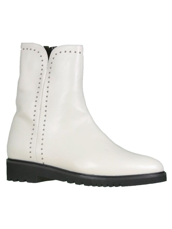 Een enkellaarsje van Cristian Daniel in de kleur roomwit . Langs de buitenkant van de schacht en de bovenrand zijn kleine zilver kleurige studs. Aan de binnenkant is een rits.De schacht is met leder gevoerd.
