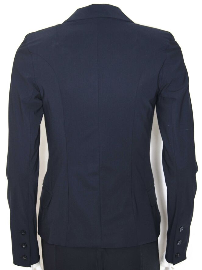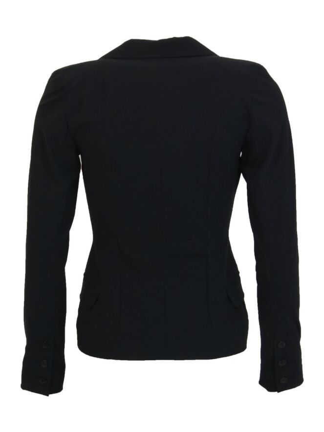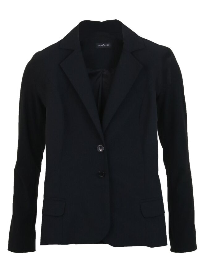 Een blazer van het merk Cassiopée in een stretch kwaliteit in de kleur zwart. de blazer heeft 2 kleine zakjes op het voorpand en een slanke revers. De blazer is van binnen gevoerd. De blazer mag niet worden gewassen.