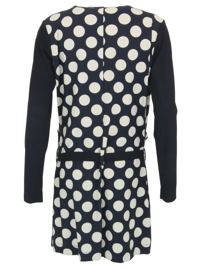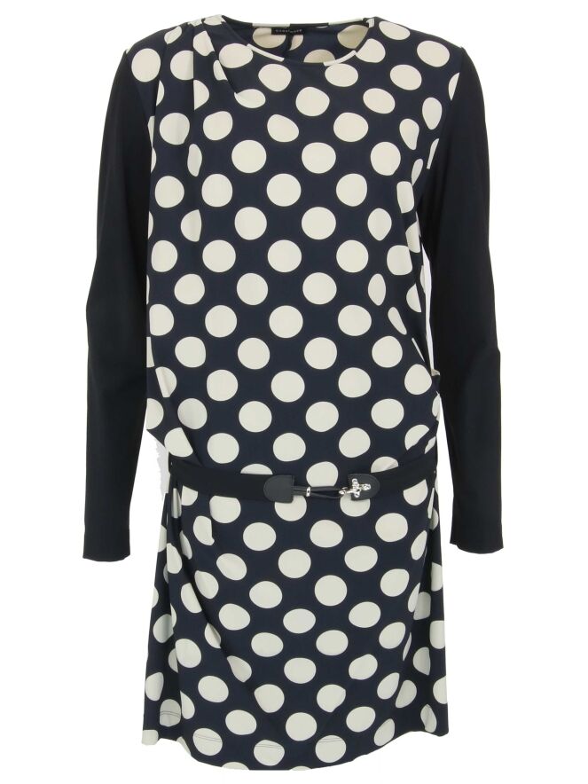 Een tuniek van Cassiopée welke ook als jurk kan worden gedragen. De jurk heeft als print grote ecru kleurige ballen op een zwarte basiskleur. Het tuniek heeft een ceintuur met een zilverkleurige gesp. De jurk mag op 30 graden worden gewassen.
