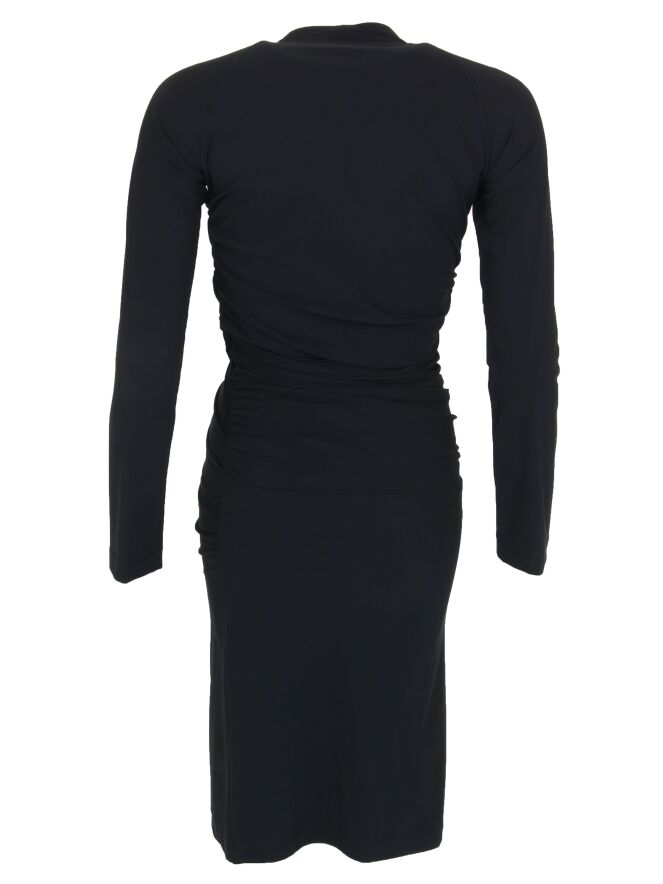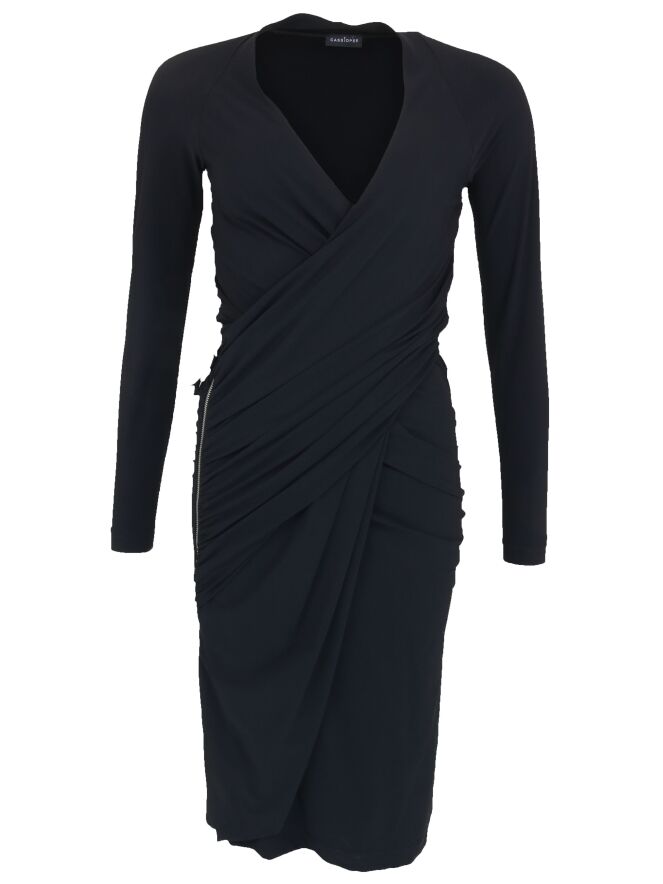 Een overslag jurk van Cassiopée in de kleur zwart. Vanaf de taille is vanuit de linkerkant een diagonale rits met geplooide stof wat een drapeer effect geeft. Deze jurk mag op 30 graden worden gewassen.