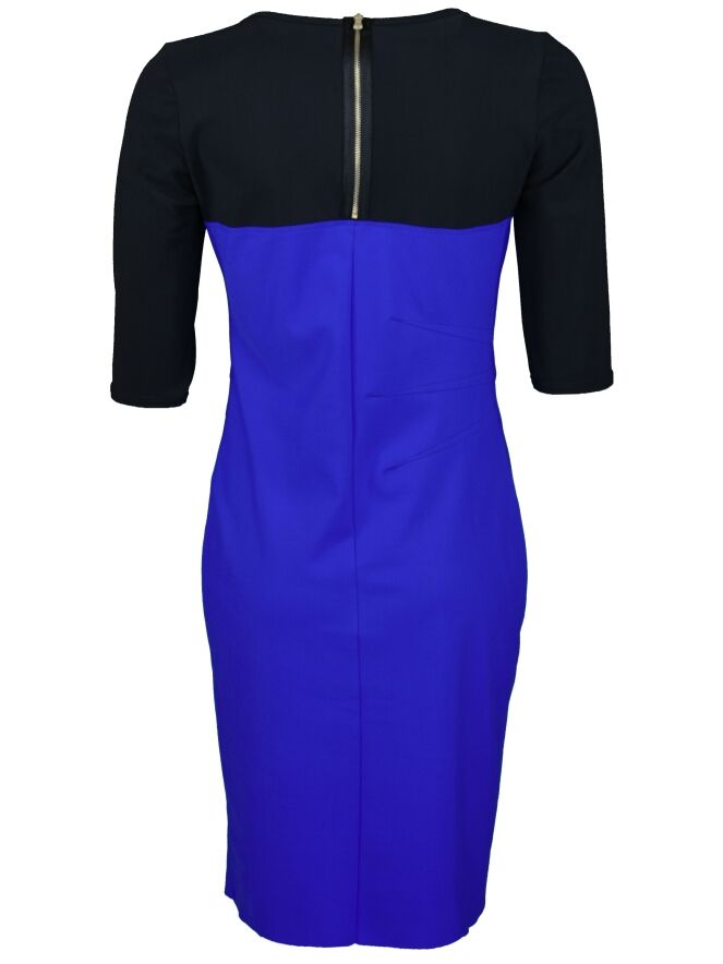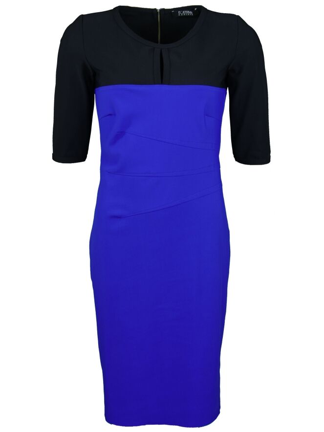 Een jurk van het merk d\'Etoiles Casiopé in de kleuren zwart met kobalt blauw. De jurk is licht getailleerd met met vanaf de rechterzijde 3 geplooide stiknaden ter hoogte van de taille. De jurk heeft half lange mouwen en een ronde hals. deze jurk mag op 30 graden worden gewassen.