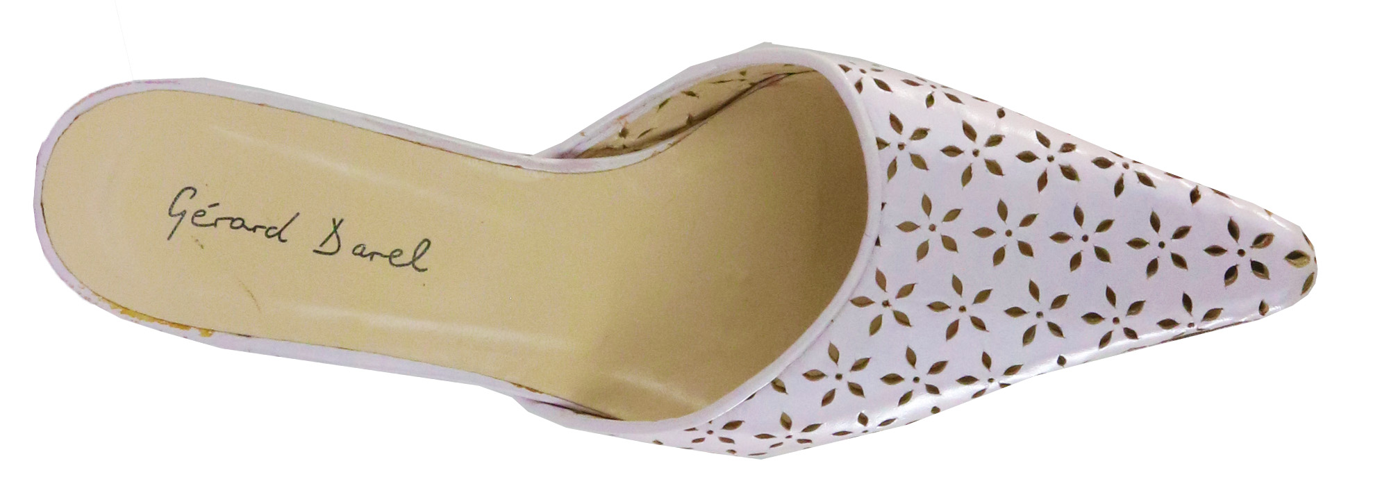 Een muiltje van Gerard Darel in de kleur roze. Het leder is geperforeerd in een bloemetjes patroon. Het muiltje heeft een spitse neus.