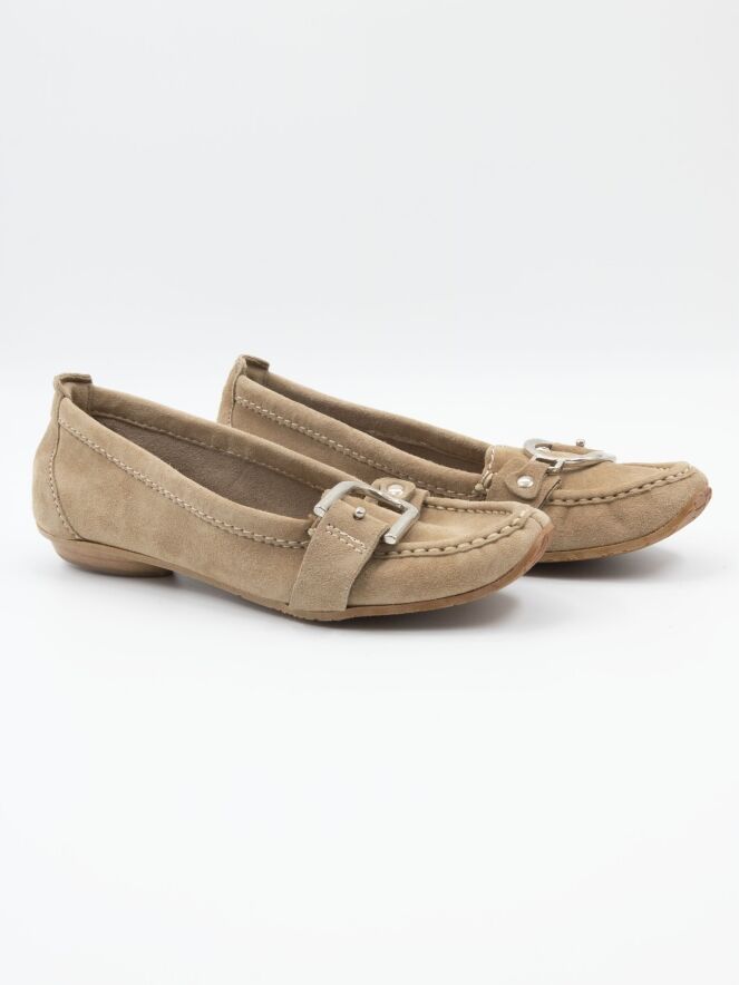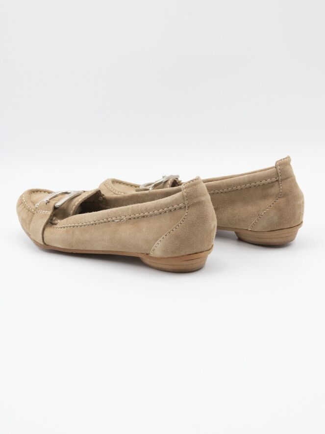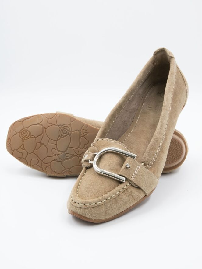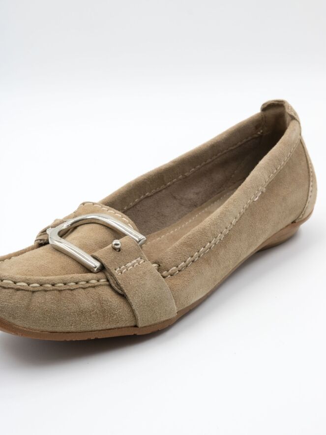 Een mocassin van DMN in de kleur zand. Over de voorvoet loopt een band met een zilverkleurige gesp. De binnenkant is ongevoerd.