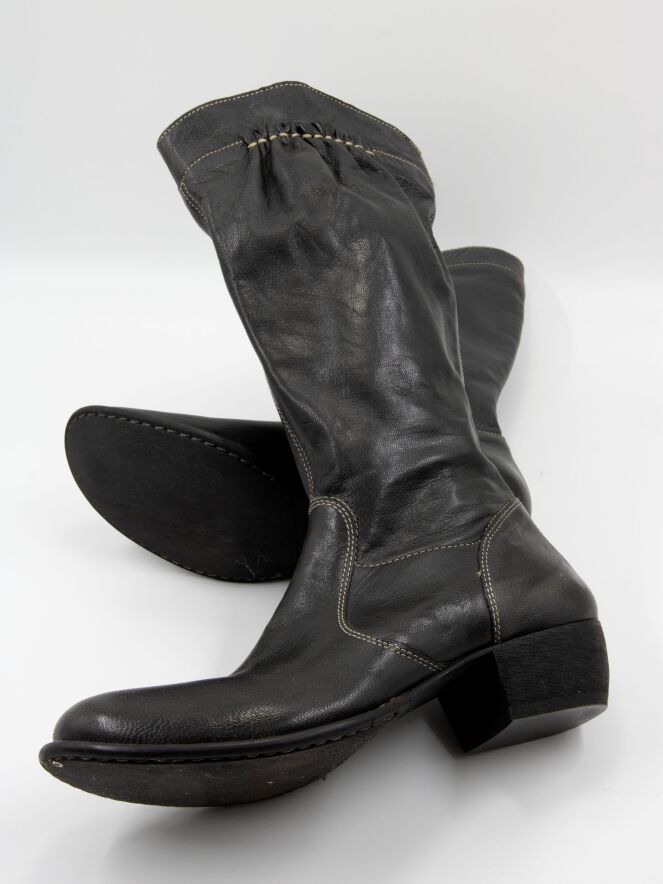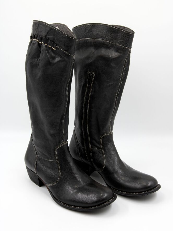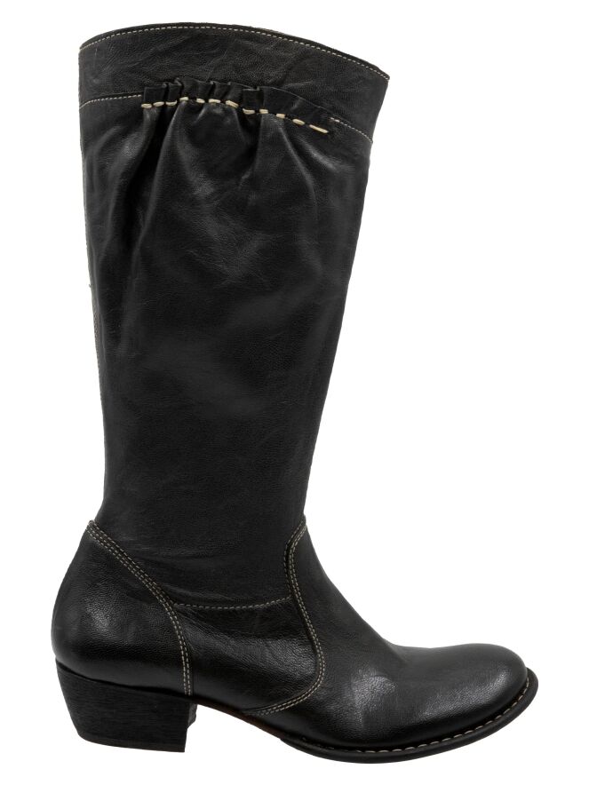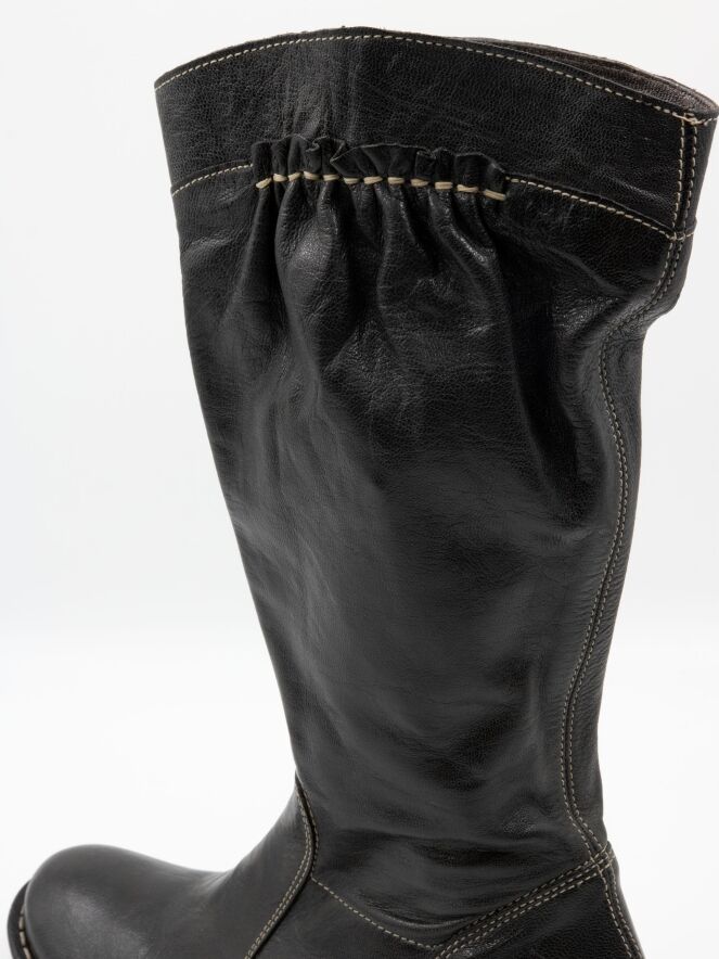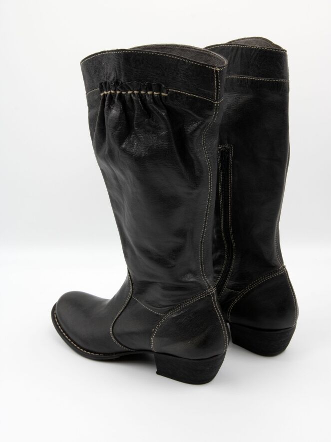 Een halfhoge laars van DMN in de kleur zwart. De laars heeft witte stiksels en aan de bovenzijde van de schacht bevindt zich aan de buitenzijde een rand van fijn geplooid leder, afgewerkt met wit stiksel. Aan de binnenzijde van de schacht loopt een rits tot en met de kuit.