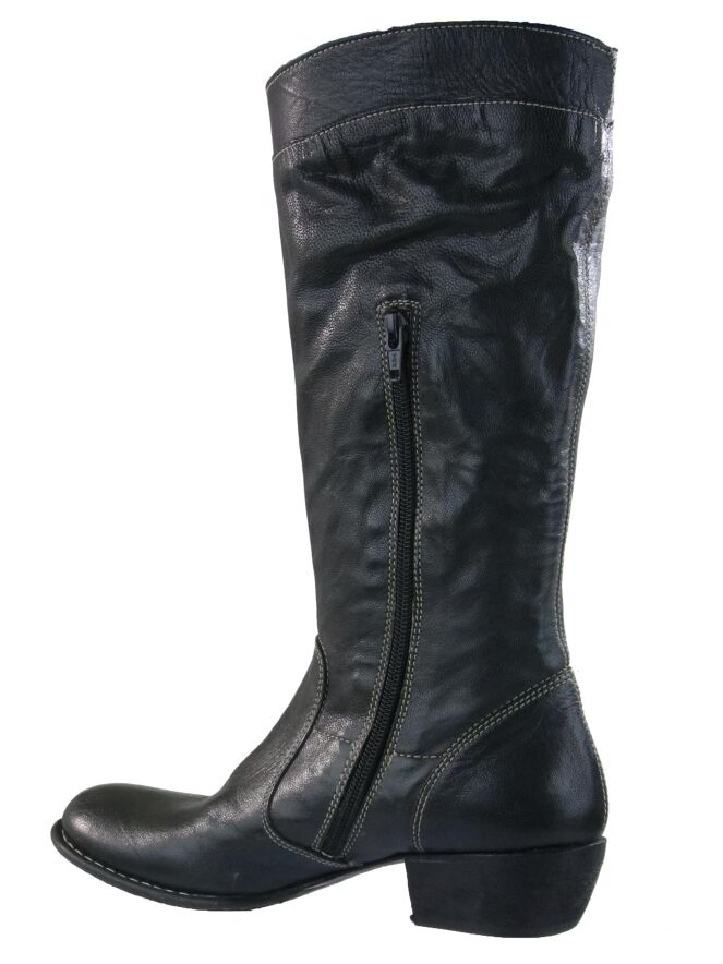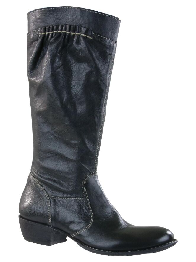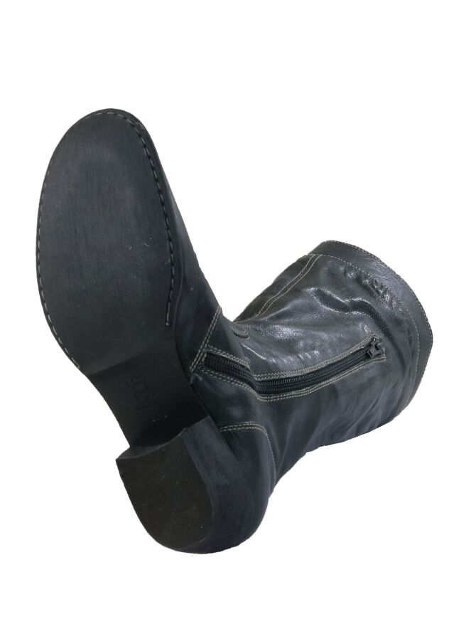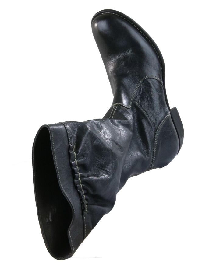 Een half hoge laars van DMN in een zwarte kleur. De stiksels zijn in een witte kleur. Aan de bovenkant van de schacht is aan de buitenzijde een deel van het leder fijn geplooid. De binnenkant van de laars is ongevoerd.