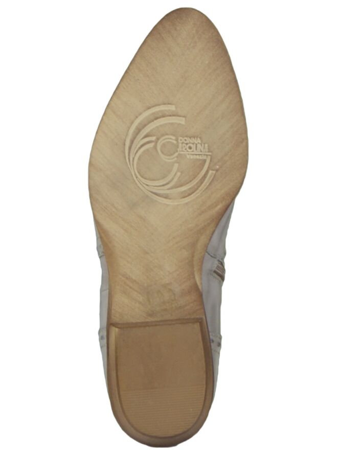 Een kort instap laarsje van Donna Carolina op een klein hakje. Het laarsje heeft een combinatie van fijne stiksels en grove stiksels in een patroon dat ook wel gezien wordt bij western laarsjes. Aan de binnenzijde zit een rits wat voor meer gemak zorgt bij het aantrekken van het laarsje. Het laarsje van Donna Carolina is van binnen ongevoerd.