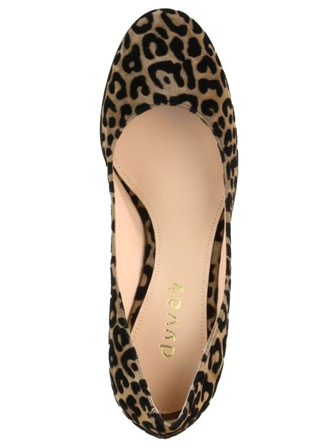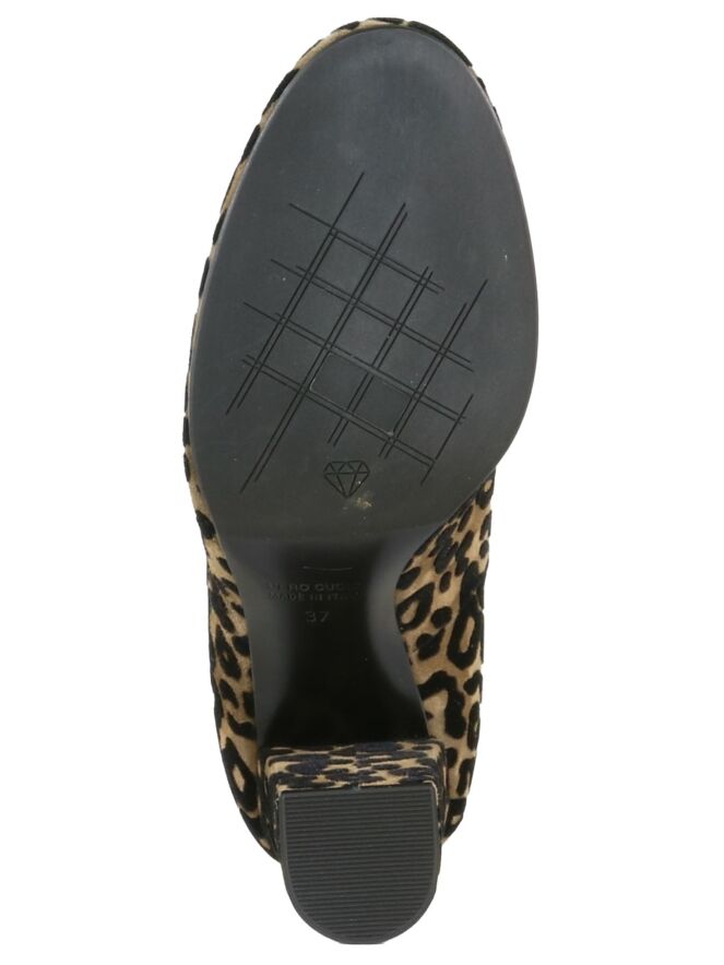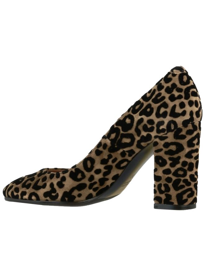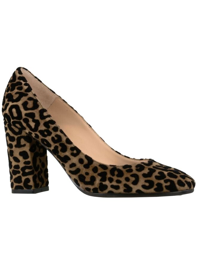 Een pump van het merk Dyva in een luipaard print met de kleuren zwart en cognac. De pump heeft een ronde neus en een elegante blokhak welke is bekleed met hetzelfde materiaal als de pump. De binnenkant van de pump is met leder gevoerd. Bij deze pump hoort een tasje met artikelnummer: 404066203