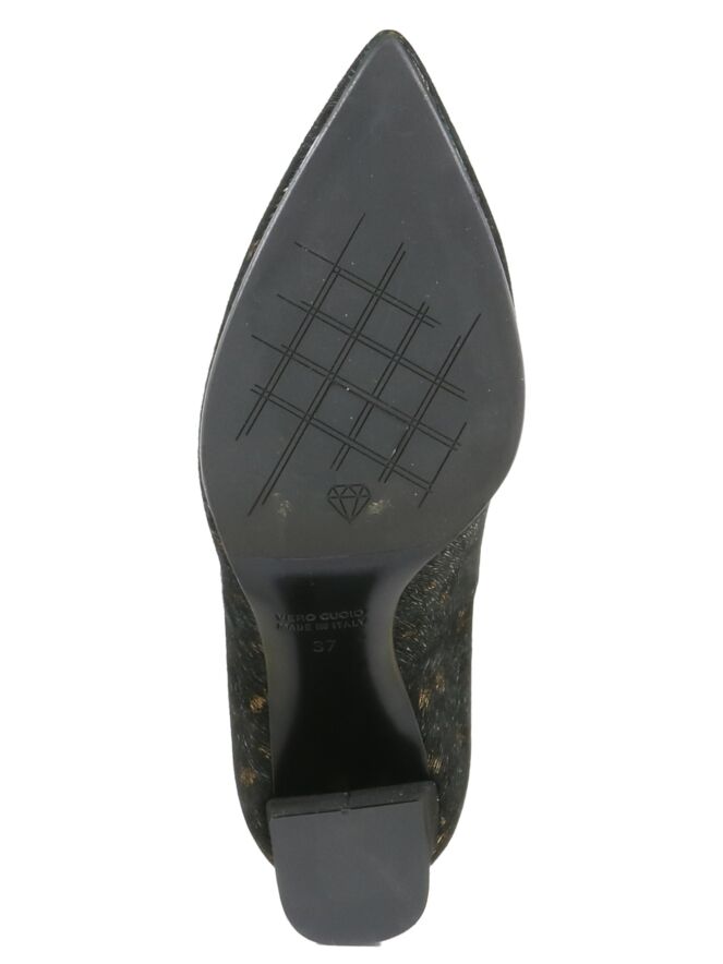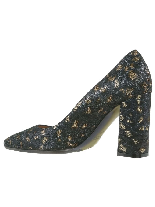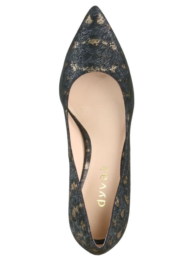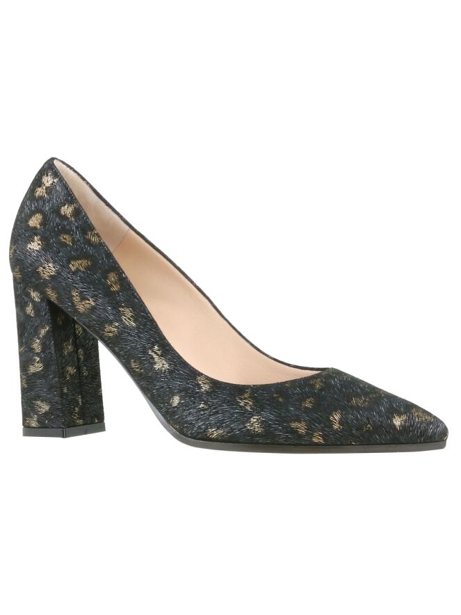 Een pump van het merk Dyva in een print met de kleuren zwart en goud. De pump heeft een spitse neus en een elegante blokhak welke is bekleed met hetzelfde materiaal als de pump. De binnenkant van de pump is met leder gevoerd.
