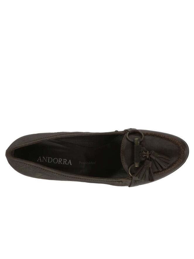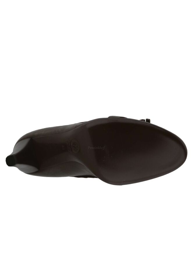 Een pump van Dyva in de kleur mokkabruin. Langs de rand van de voorvoet is een omgekeerde stiknaad. Op de voorvoet is een bitje met 2 kwastjes. De slank toelopende hak is in een neutrale donkerbruine kleur. De binnenkant is met leder gevoerd.