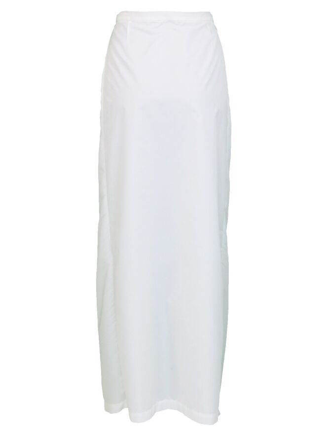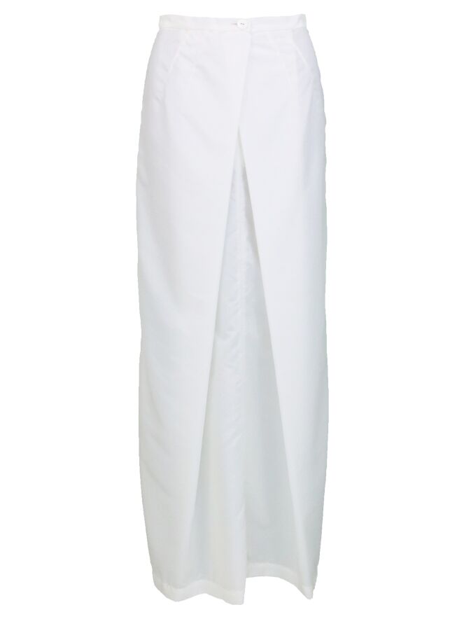Een lange rok van E - Due in de kleur wit. Aan de voorzijde is de stof dubbel met een diagonale lijn naar de onderkant. De rok is ongevoerd en mag niet worden gewassen.