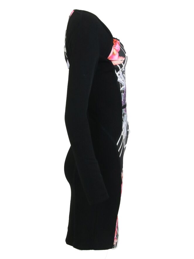 Een jurk van Etoile du monde in een roze bloemenprint op een zwarte achtergrond. De tasille is geaccentueerd door een smalle horizontale bies . De achterzijde van de jurk is in effen zwart. Deze jurk mag koud op de hand worden gewassen.