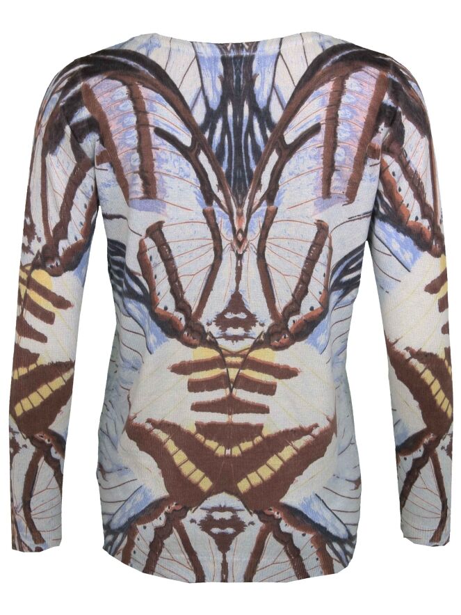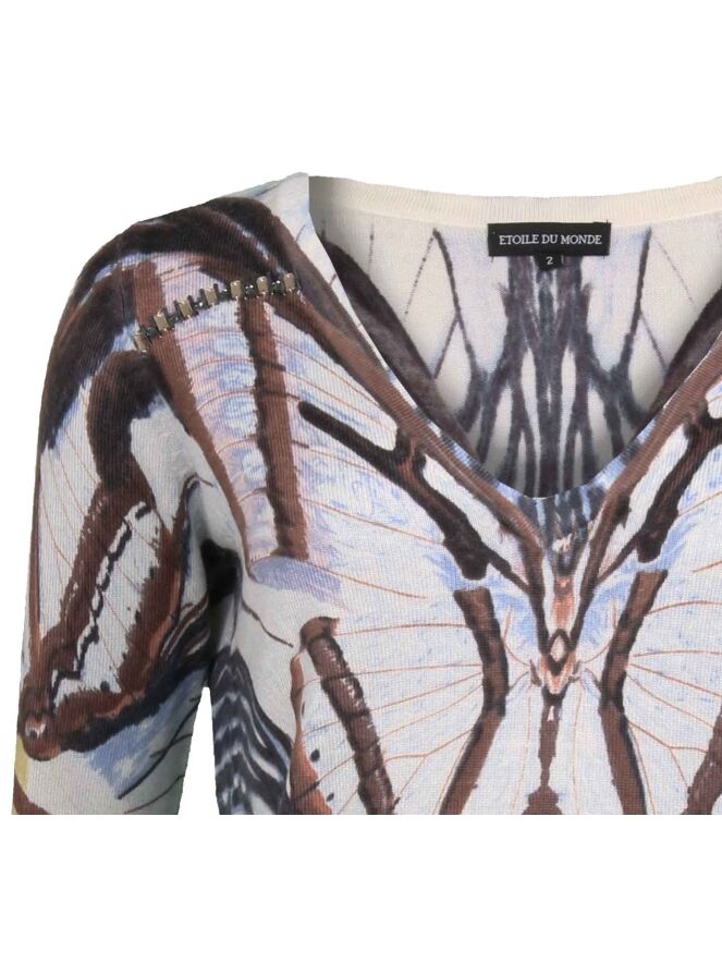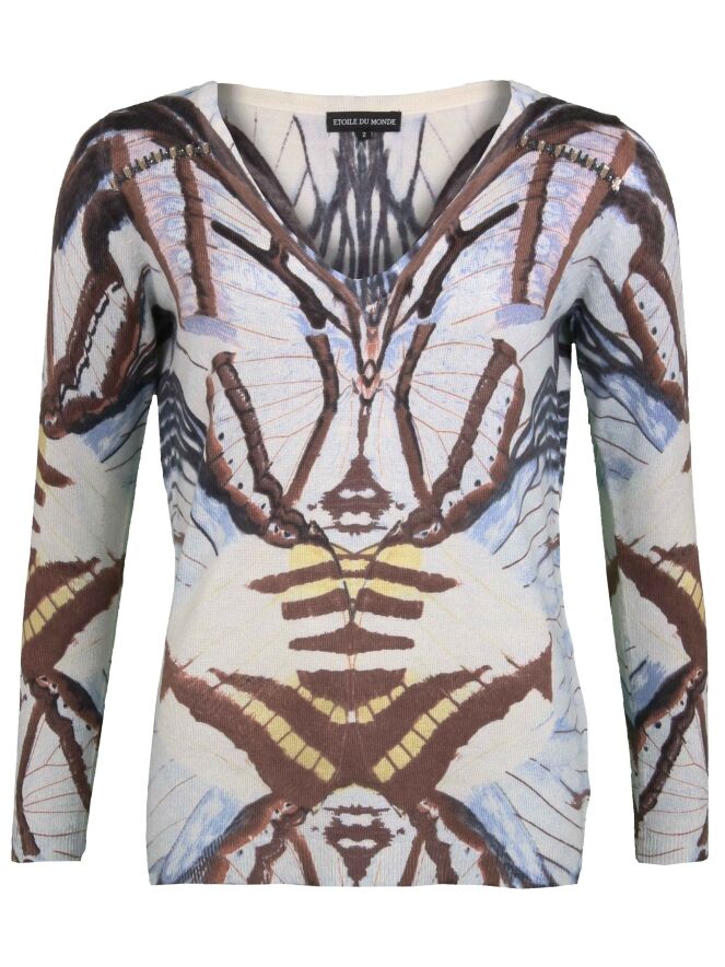 Een pullover van het merk Etoile du Monde in een grafische print met de kleuren bruin, zwart en ijsblauw op een roomwitte achtergrond. Ter hoogte van de schouders zijn stras steentjes. De pullover heeft een V hals en mag op 30 graden worden gewassen.