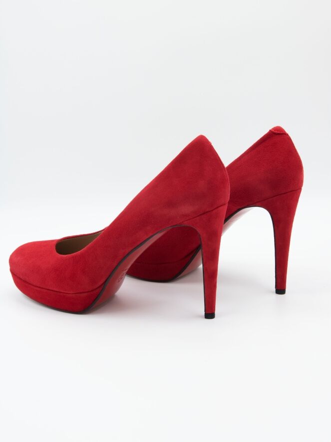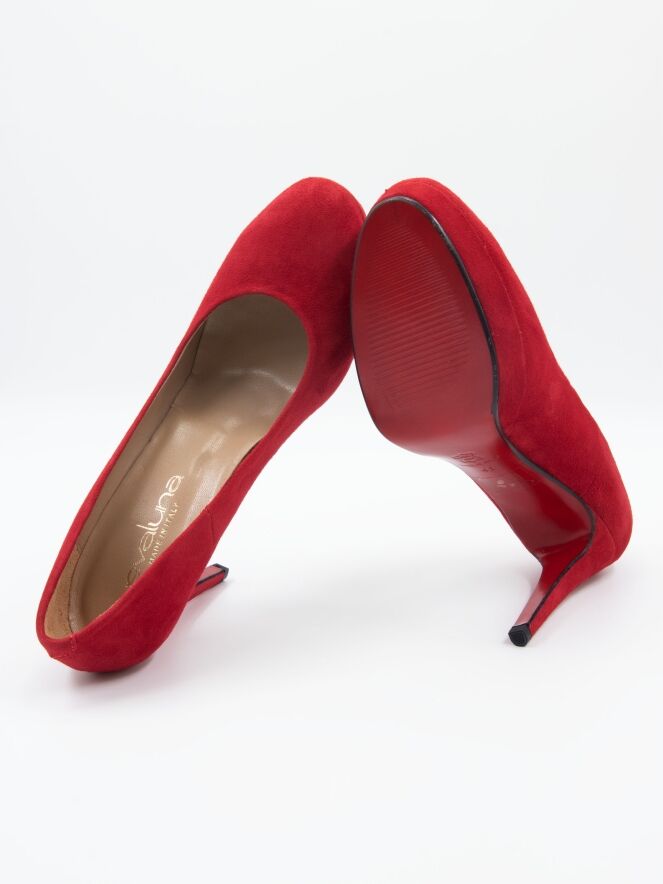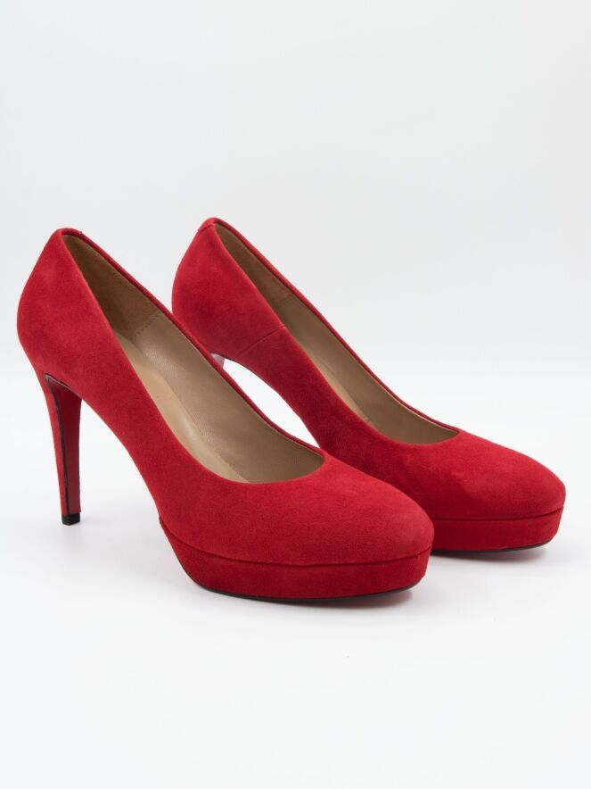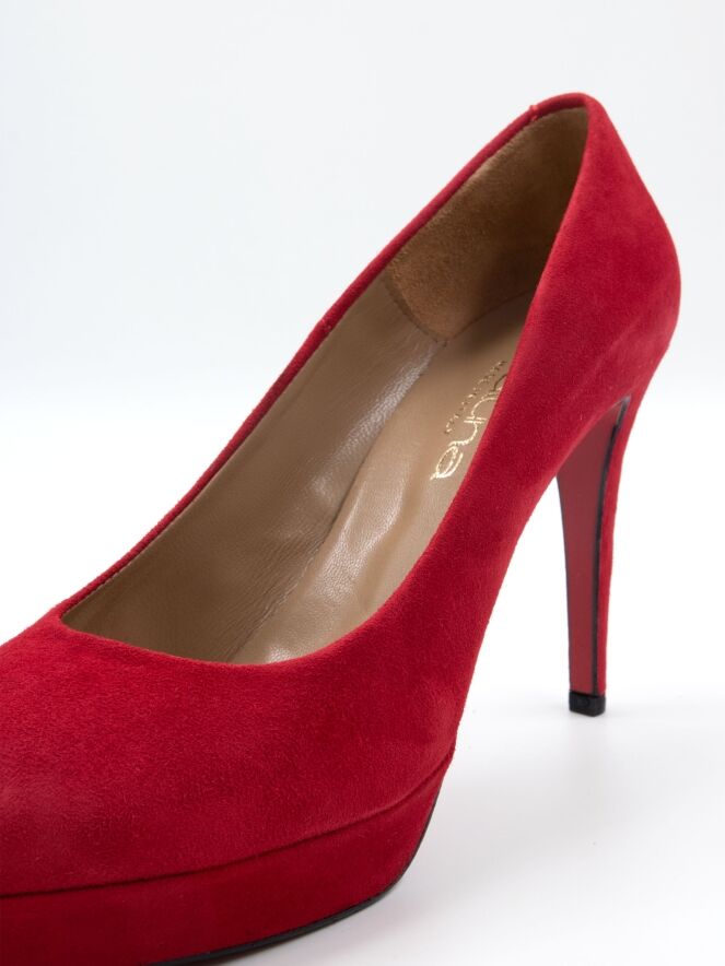 Een pump van Evaluna in de kleur rood. De plateauzool en de hoge elegante hak is bekleed in hetzelfde materiaal als de pump. De binnenkant is met leder gevoerd.