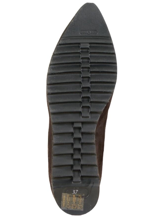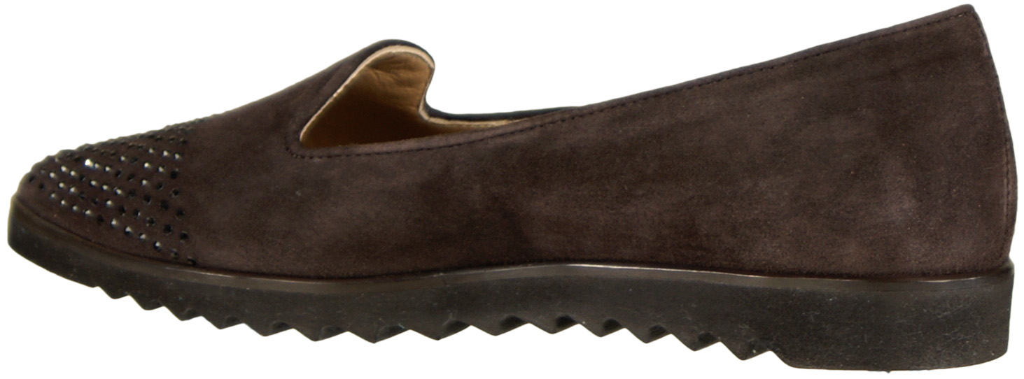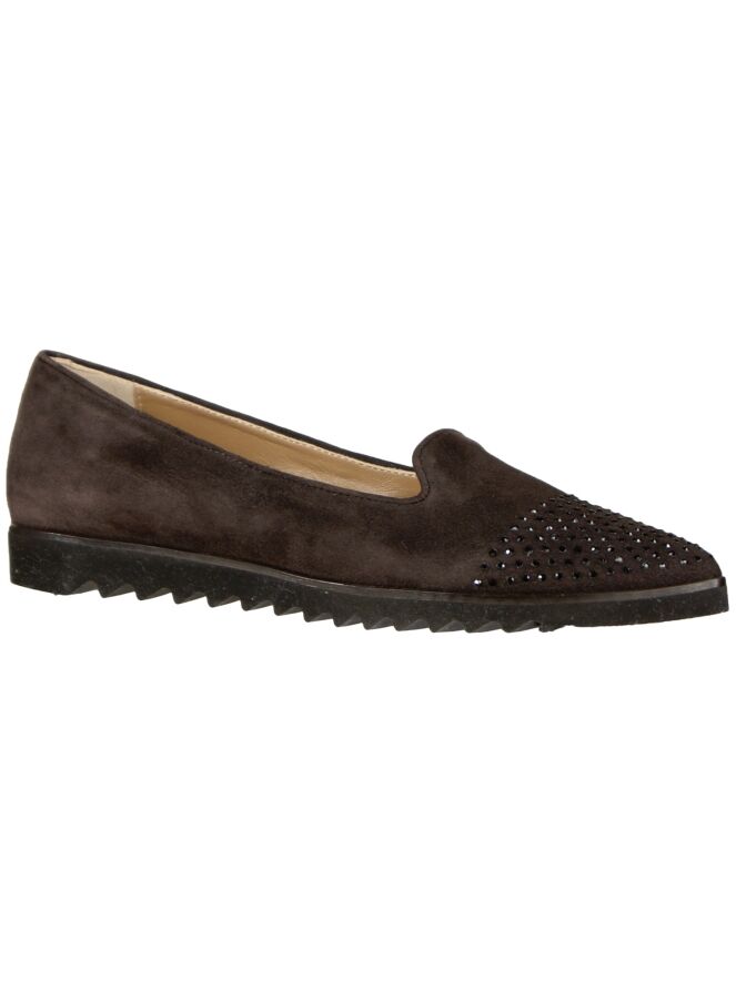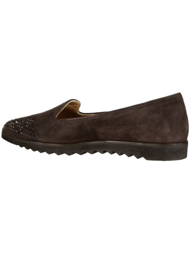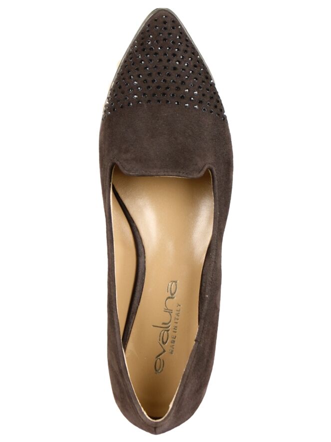 Een instapper van het merk Evaluna in de kleur mokka bruin. De neus van de instapper is bekleed met stras steentjes. De gekartelde zool geeft een sportief karakter aan de instapper. Deze schoen is aan de binnenzijde met leder gevoerd.
