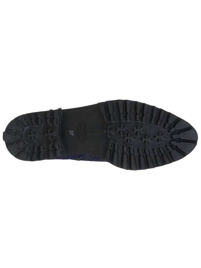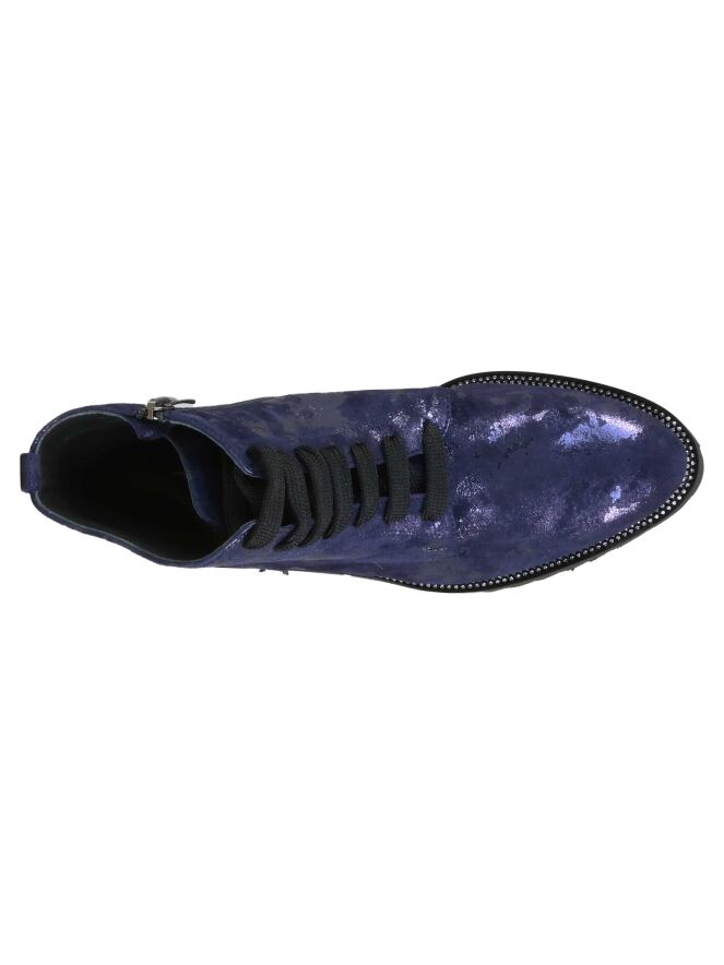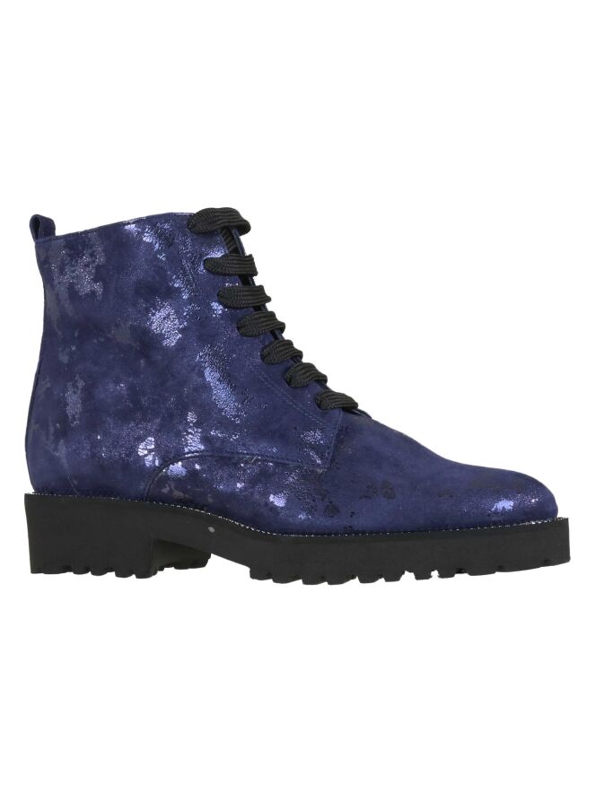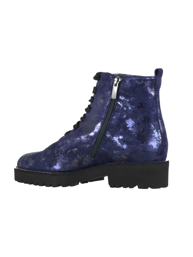 Een sportief veterlaarsje van Evaluna in een military look met meerdere tinten blauw. Langs de rand van de zool is een bies van strassteentjes. Aan de binnenzijde is een rits en de binnenkant van het laarsje is met leder gevoerd.