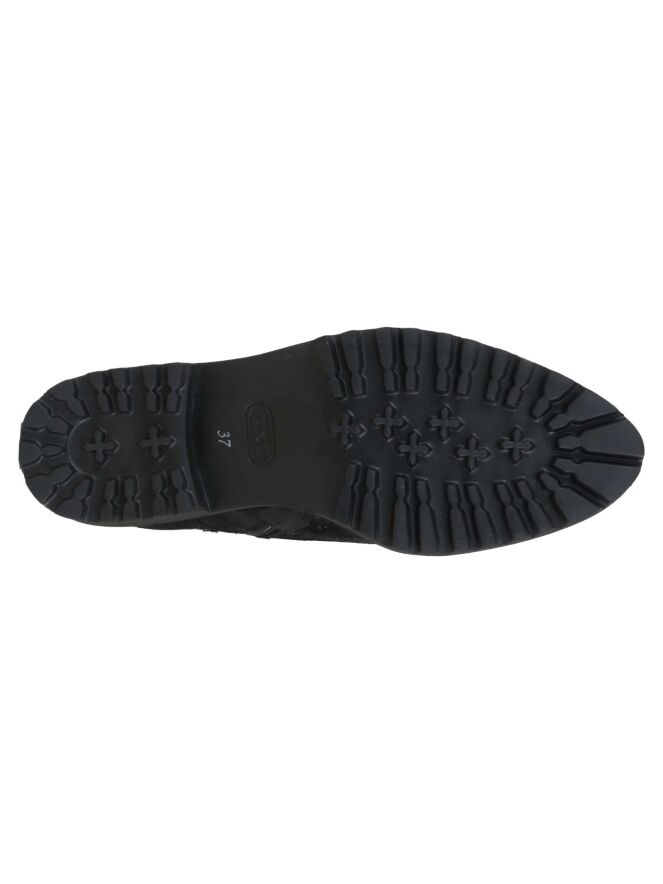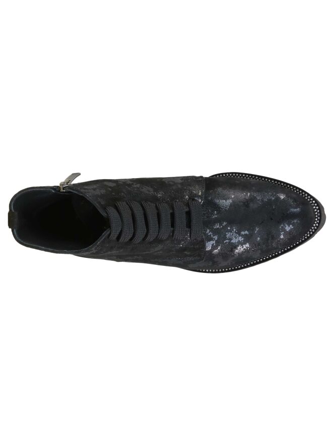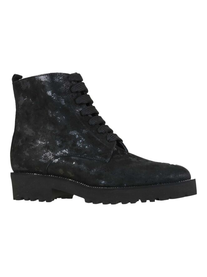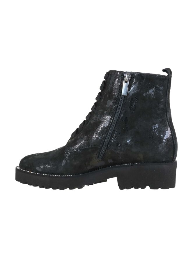 Een sportief veterlaarsje van Evaluna in een military look met meerdere tinten zwart. Langs de rand van de zool is een bies van strassteentjes. Aan de binnenzijde is een rits en de binnenkant van het laarsje is met leder gevoerd.