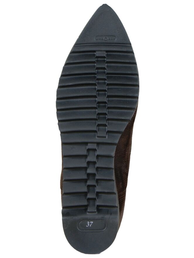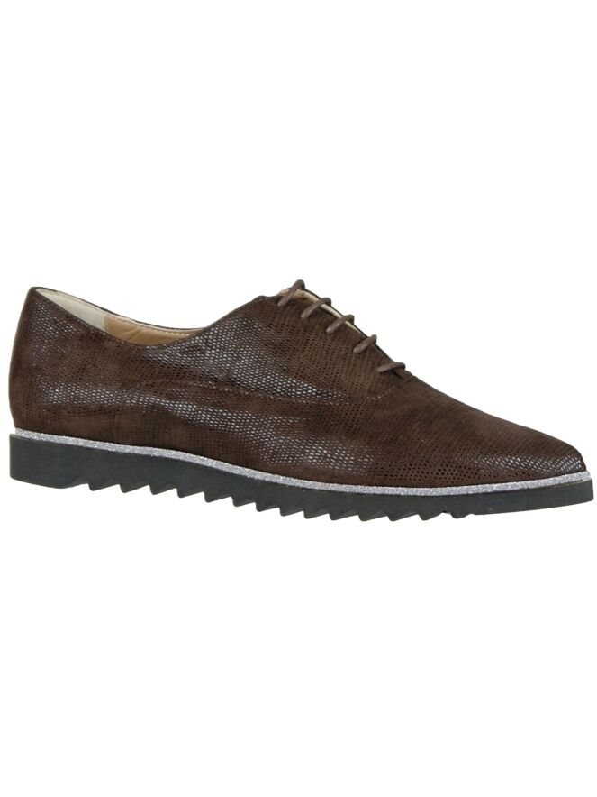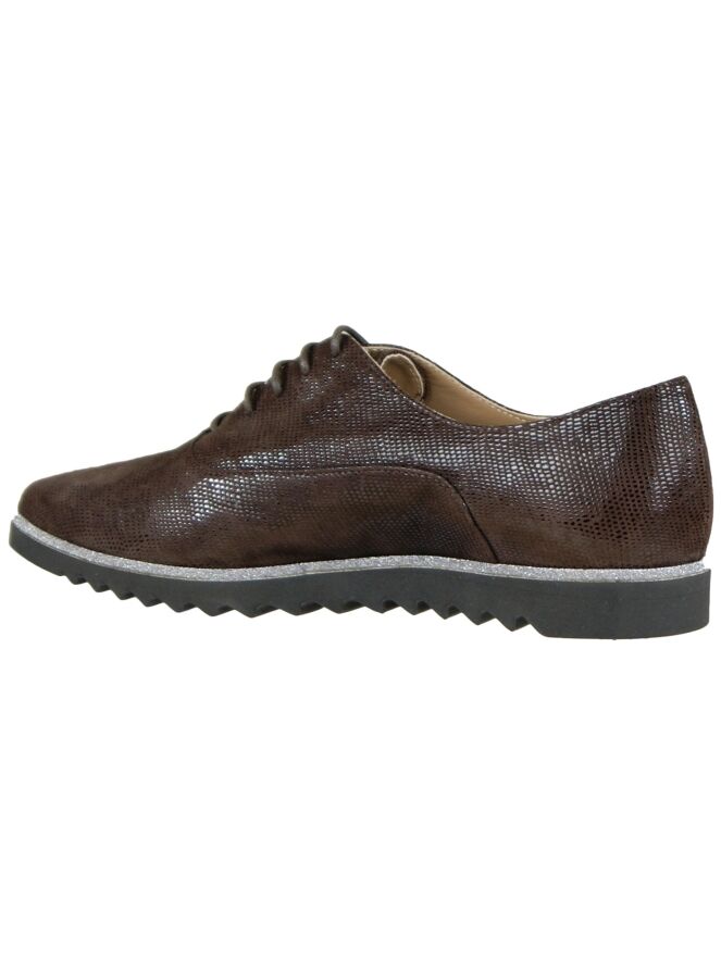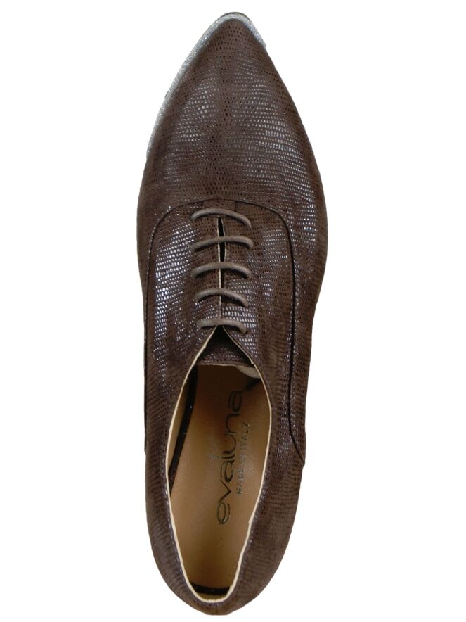 Een veterschoen van het merk Evaluna in een gevlamde kleur bruin in een fijne reptiel print. De schoen heeft een sportieve gekartelde zool met een bies bij de aanhechting van de schoen in een metallic zilveren kleur. Deze veterschoen is aan de binnenzijde met leder gevoerd.
