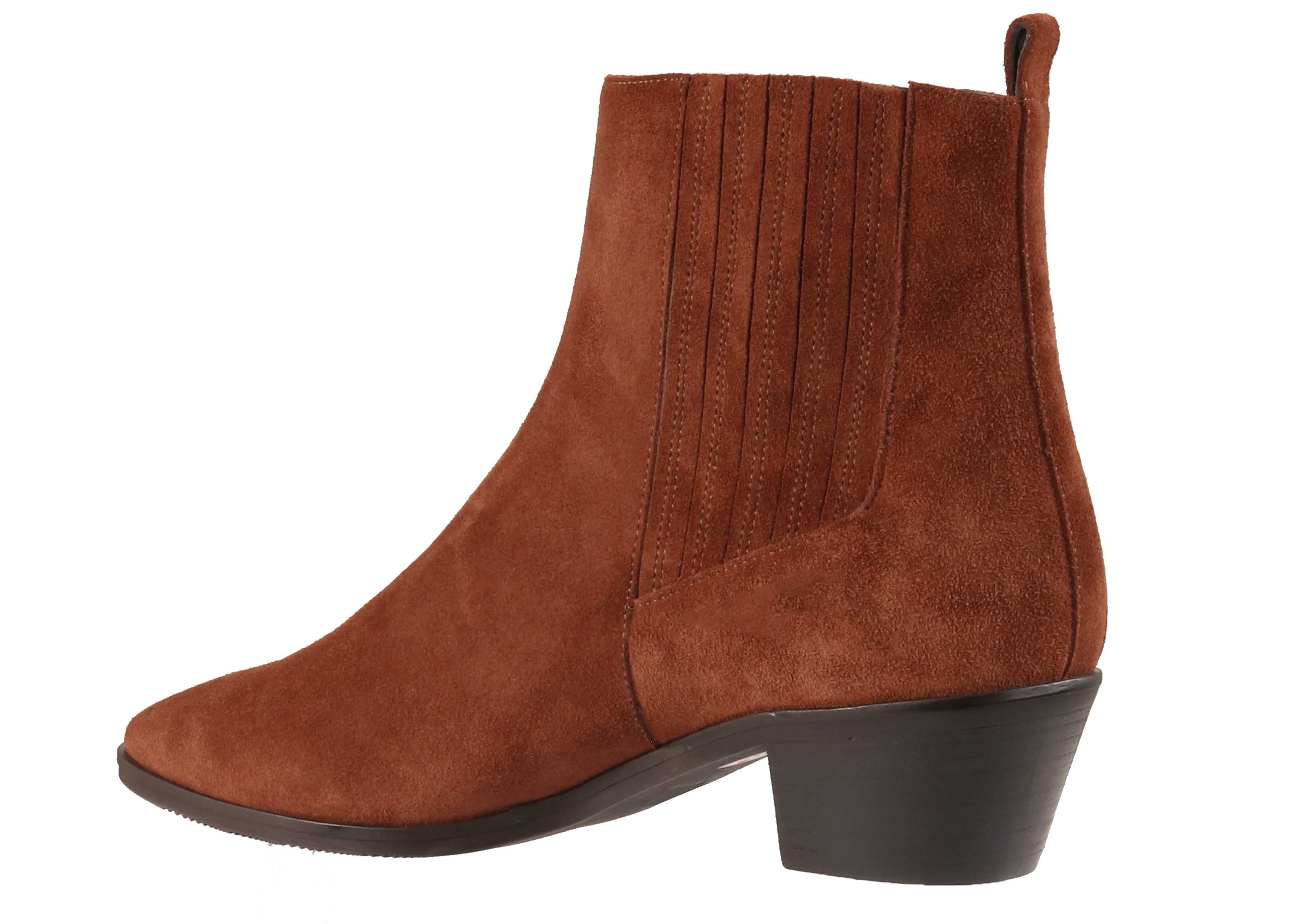 Een kort westernlaarsje van Evaluna in de kleur roest. Aan beide zijkanten is het suède gesneden met elastiek achter het suède. Het laarsje heeft een spitse neus en is aan de binnenkant ongevoerd.