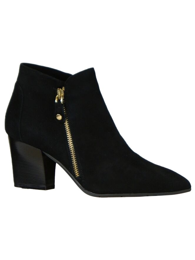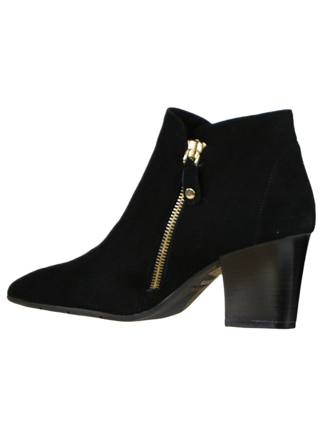 \r\nEen kort enkellaarsje in het zwart. Aan beide zijden is een goudkleurige rits ingezet. Het neusje is spits toegesneden. Het laarsje heeft een sportieve maar slank gesneden hak. De binnenzijde is met leder gevoerd.