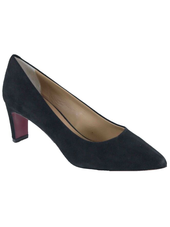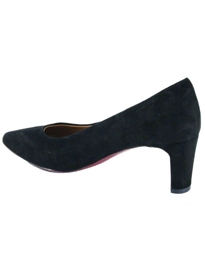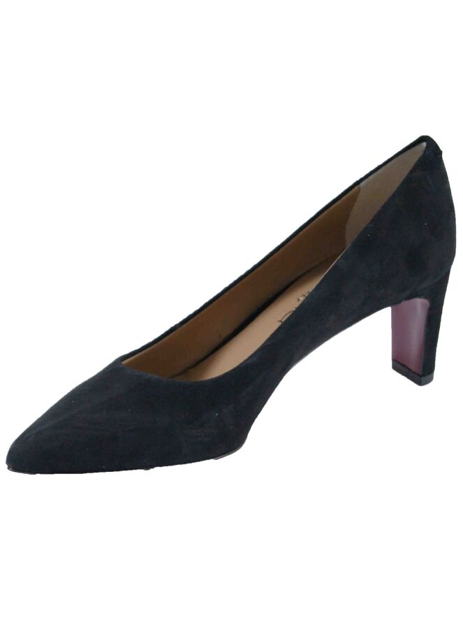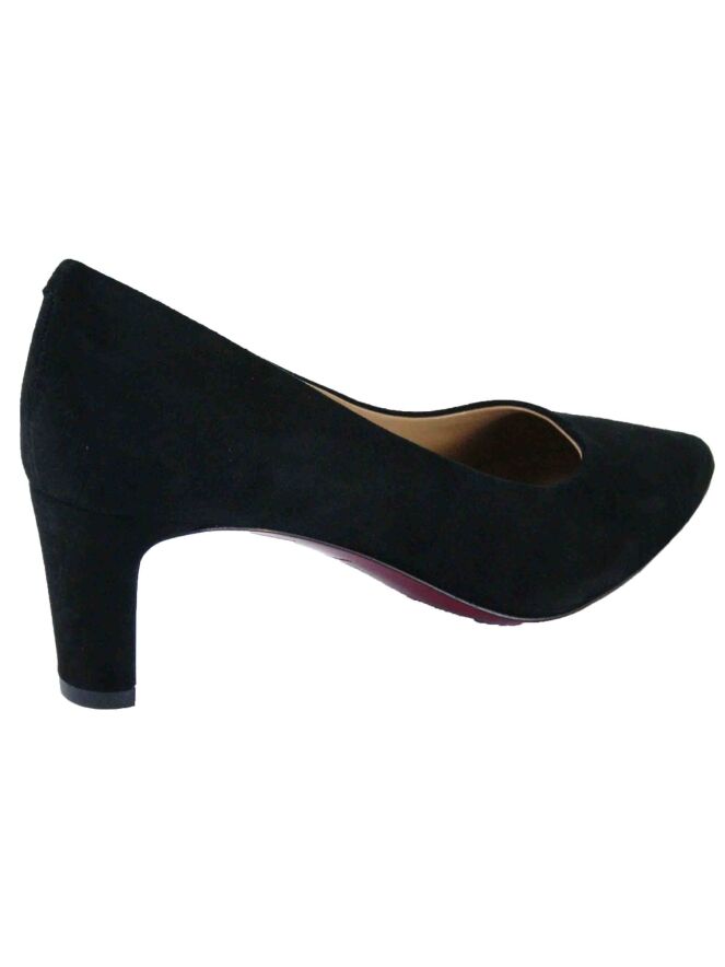 Een pump van het merk Evaluna in de kleur zwart. De pump heeft een spitse neus en heeft een elegant hakje welke is bekleed in het zelfde materiaal als de pump. De binnenzijde van de pump is gevoerd met leder.