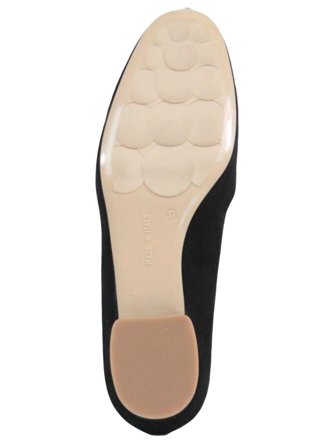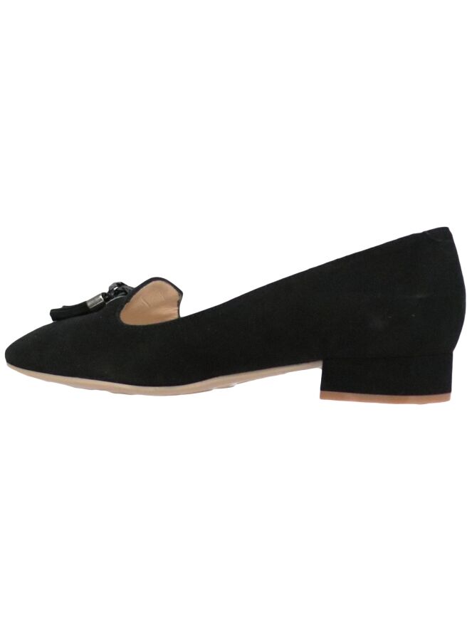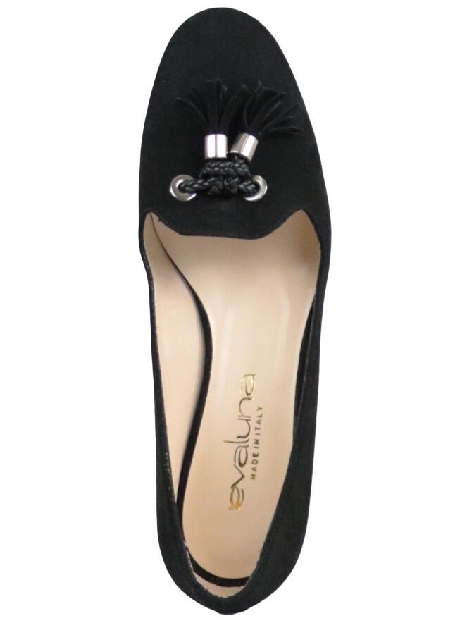 Een instapper van het merk Evaluna in de kleur zwart. Op de voorvoet is een dubbel kwastje bevestigd. De binnenzijde van de instapper is met leder bekleed.