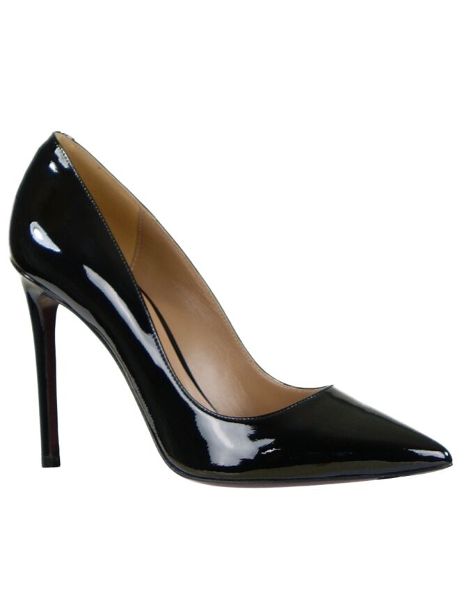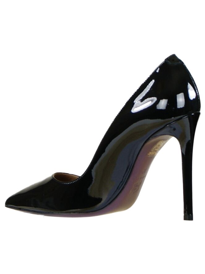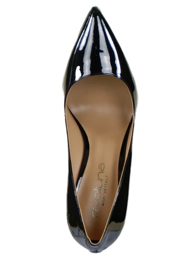 Een elegante pump van het merk Evaluna in zwart lak leder. De pump heeft een spitse neus en heeft een naaldhak van 10 cm hoog. De pump is aan de binnenzijde met leder gevoerd.
