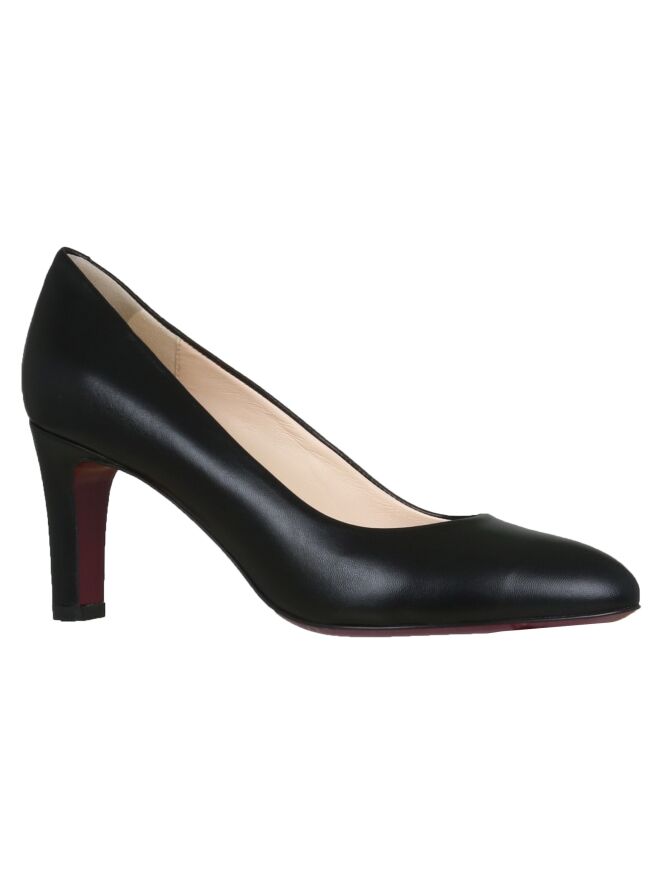 Een pump van Evaluna in de kleur zwart. De pump is in zacht nappa leder en heeft een slanke ronde neus. De elegante hak is in hetzelfde leder als de pump bekleed. De binnenkant is met leder gevoerd.