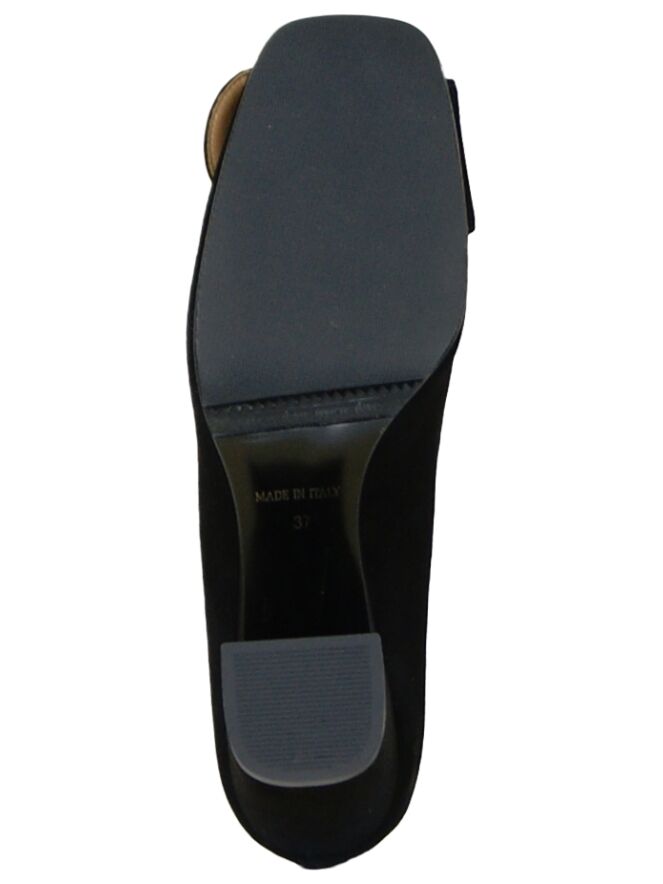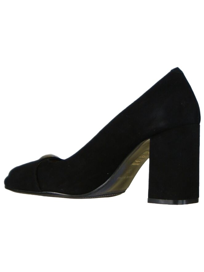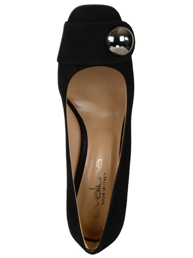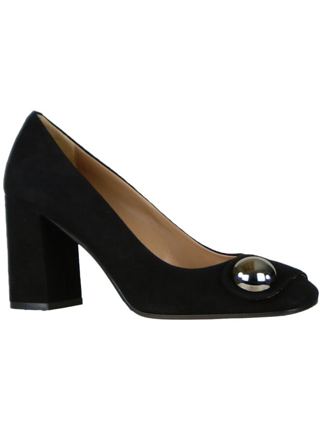 Een pump van het merk Evaluna in de kleur zwart. De pump heeft een vierkante neus met aan de buitenzijde een grote bolvormige gesp in een nikkel kleur. De pump heeft een trendy hoge blokhak en de binnenzijde van de pump is met leder gevoerd.