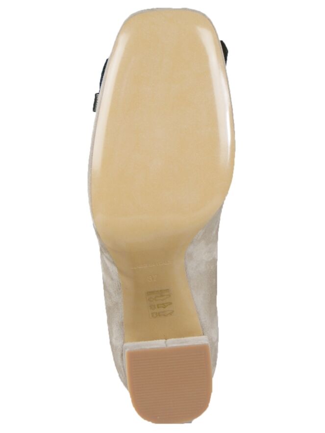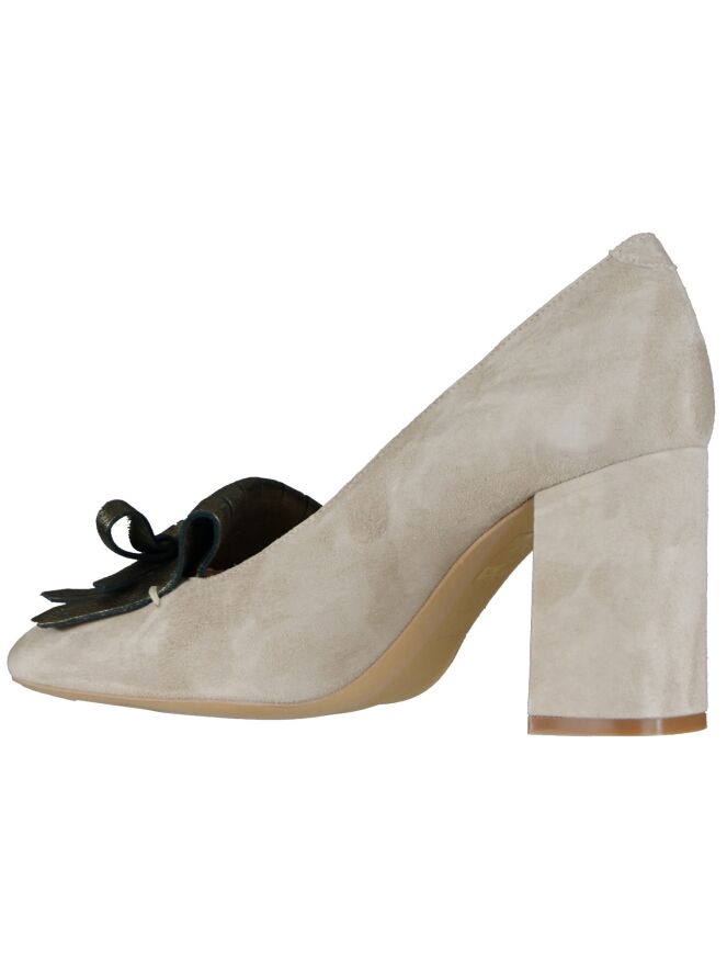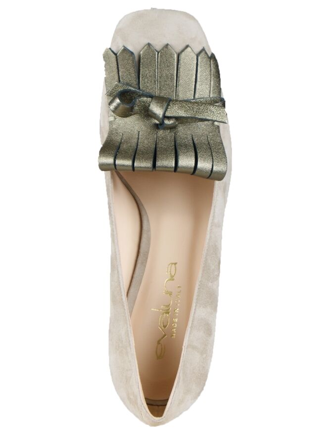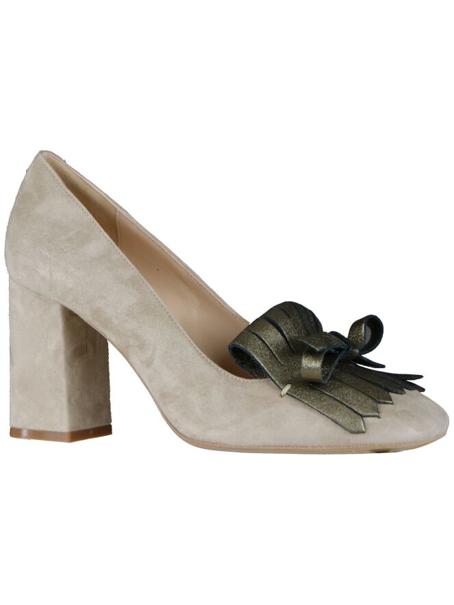 Een pump van het merk Evaluna in de kleur taupe. Over de voorvoet is een brons kleurige jamboree met een strik. De pump heeft een hoge blokhak die is bekleed in hetzelfde materiaal als de pump. Aan de binnenkant is de pump gevoerd met leder.