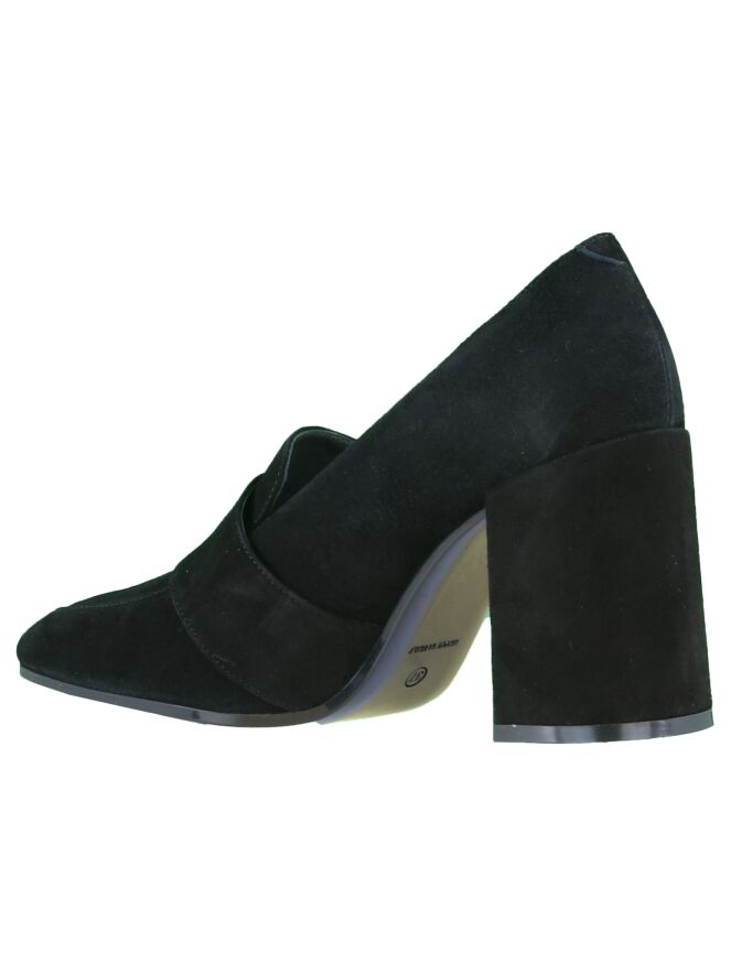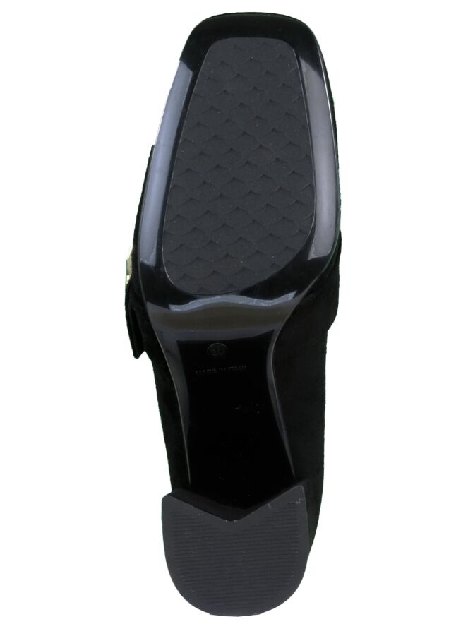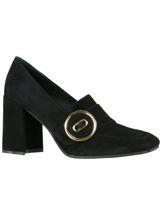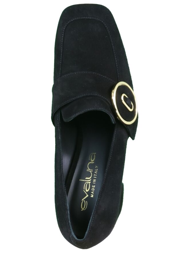 Een pump van het merk Evaluna in de kleur zwart. Over de voorvoet is een brede bies met een goud kleurige gesp. De pump heeft een hoge blokhak die is bekleed in hetzelfde materiaal als de pump. Aan de binnenkant is de pump gevoerd met leder.