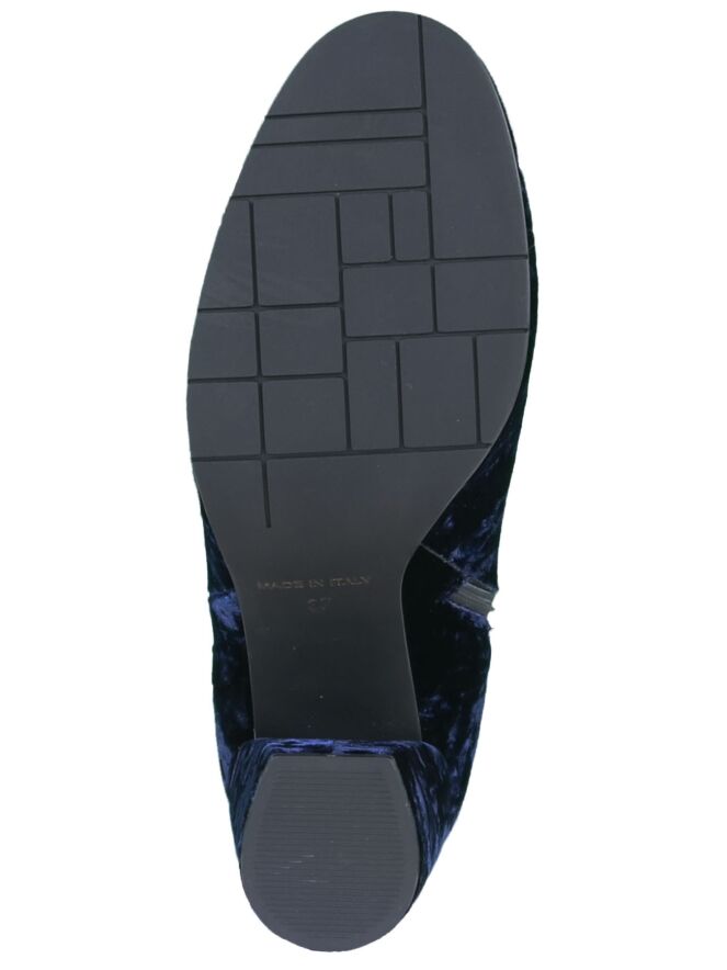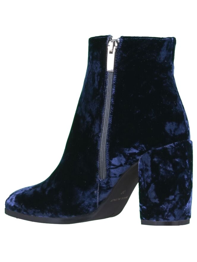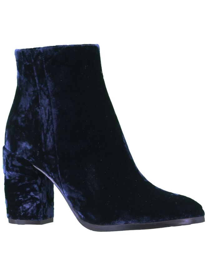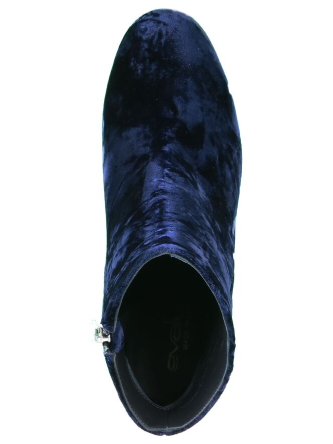 Een enkellaarsje van het merk Evaluna in de kleur marine blauw. Het laarsje heeft een ronde neus en heeft een elegante blokhak die bekleed is in hetzelfde fluweel als het laarsje. De schachthoogte is 10 cm vanaf de hiel en de schachtomtrek is 28 cm. De binnenkant van het laarsje is met leder gevoerd.