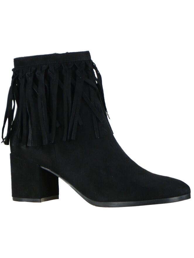 Een enkellaarsje van het merk Evaluna in de kleur zwart. Langs de bovenzijde van de schacht zijn gevlochten franjes bevestigd.Het laarsje heeft een ronde neus en een ronde blokhak. Het laarsje is aan de binnenzijde met leder gevoerd.