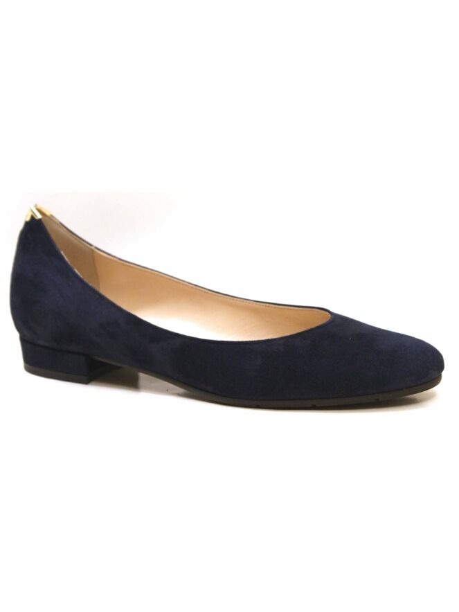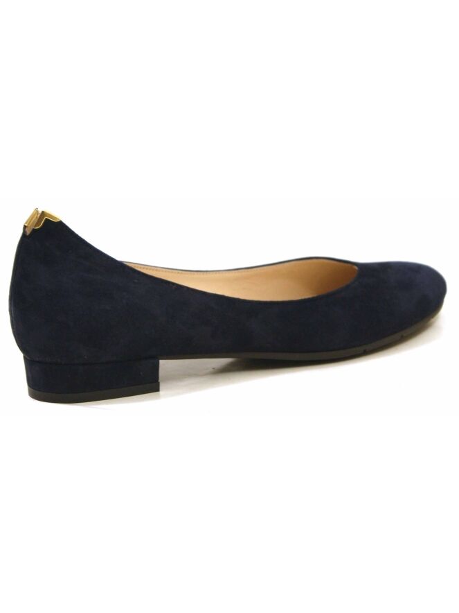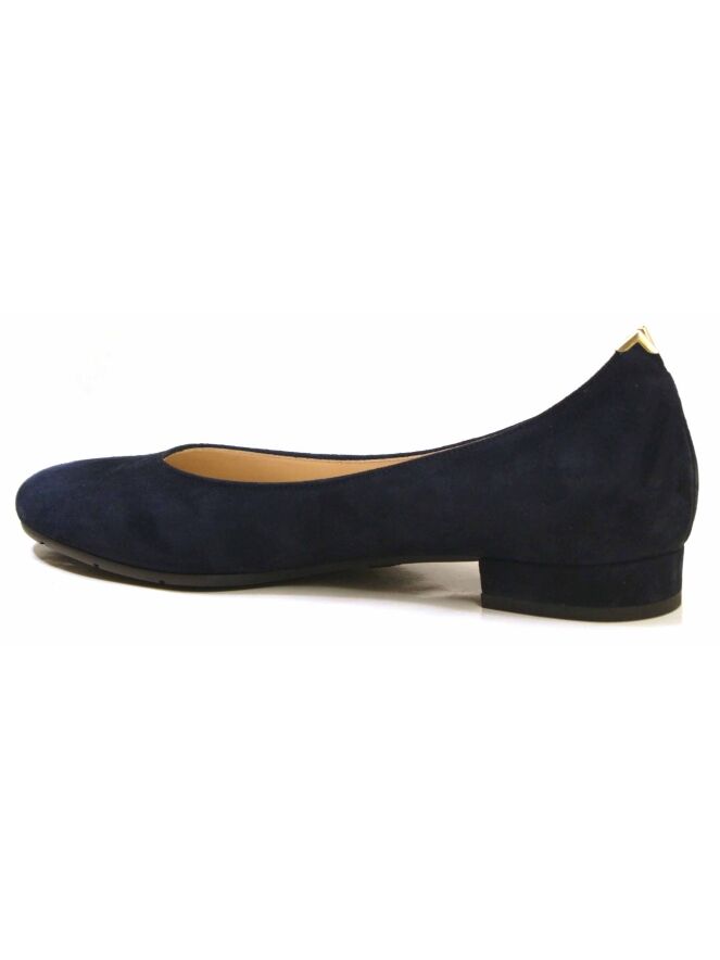 Een ballerina van Evaluna in de kleur marineblauw. De ballerina heeft een ronde neus. op de hiel is een kleine uitsnijding met een goudkleurig metalen hoekje. De binnenkant is met leder gevoerd.