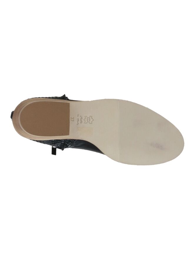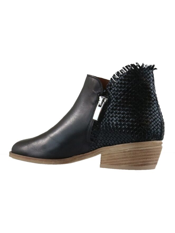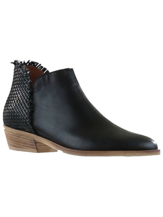 Een kort laarsje van Evaluna in de kleur zwart. De hiel en de zijkanten zijn in een gevlochten leder dat langs de rand van de schacht gerafeld is. De binnenkant is met leder gevoerd.