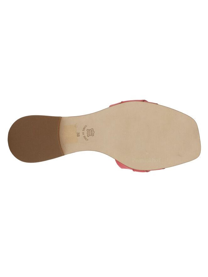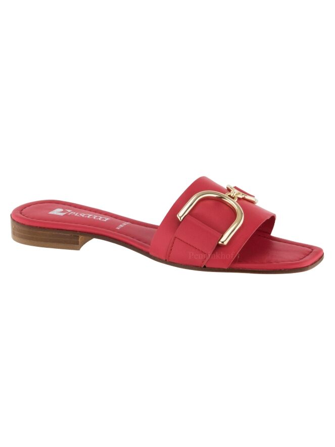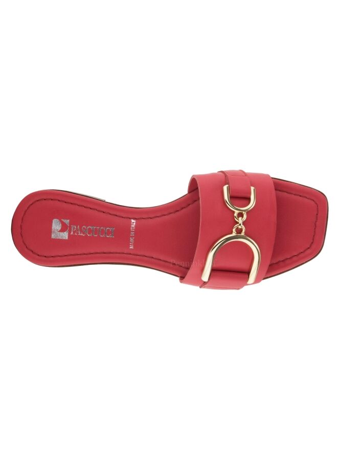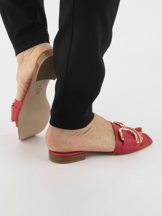 Een slipper van Even and Odd (Pascucci) in koraalrood leder. Op de voorvoet is een goudkleurige bit Het voetbed is van leder in de kleur koraalrood.