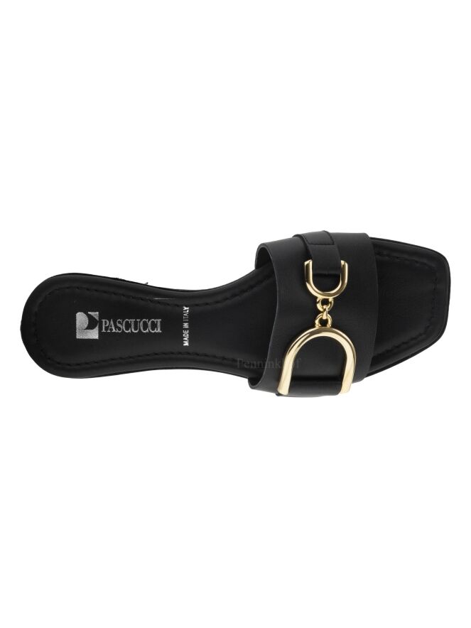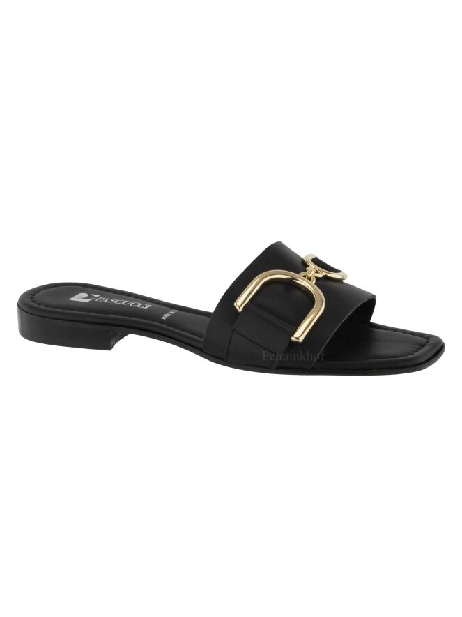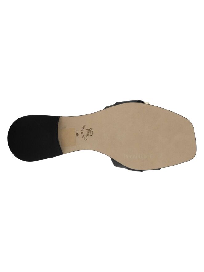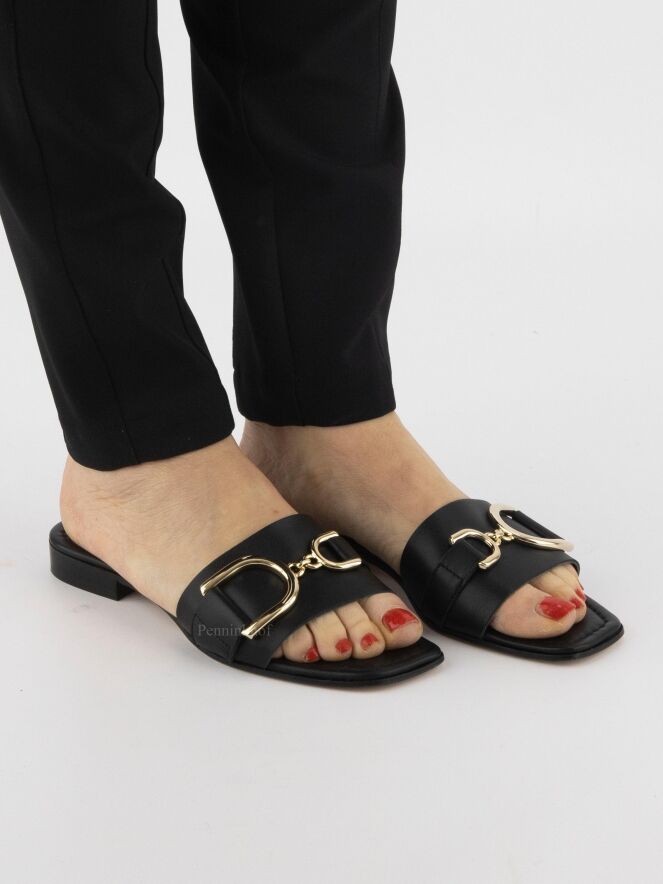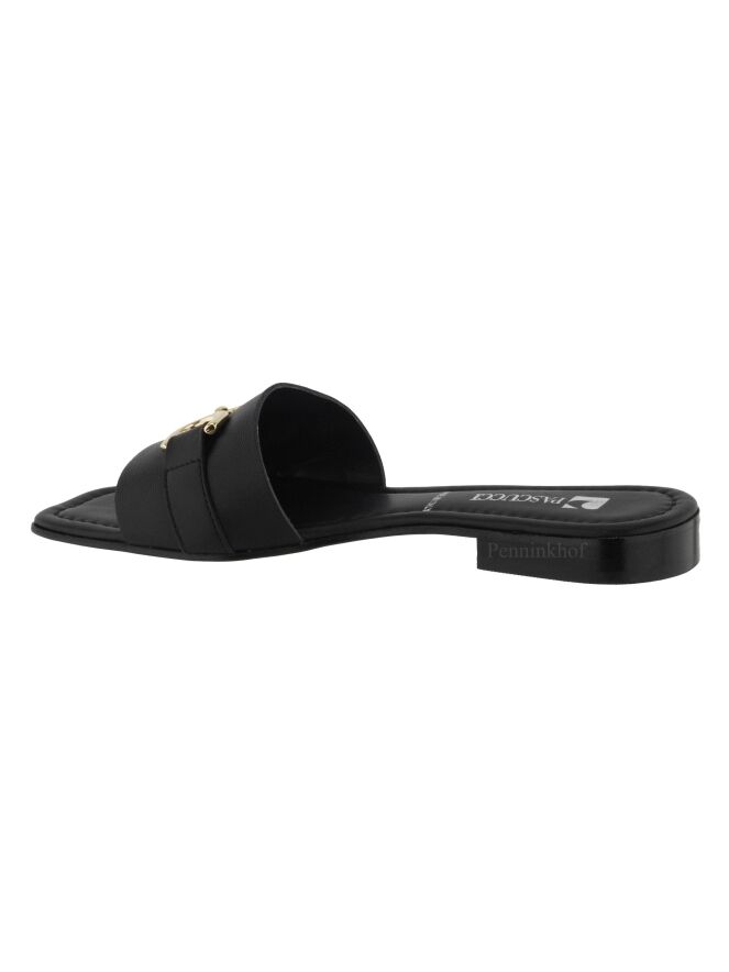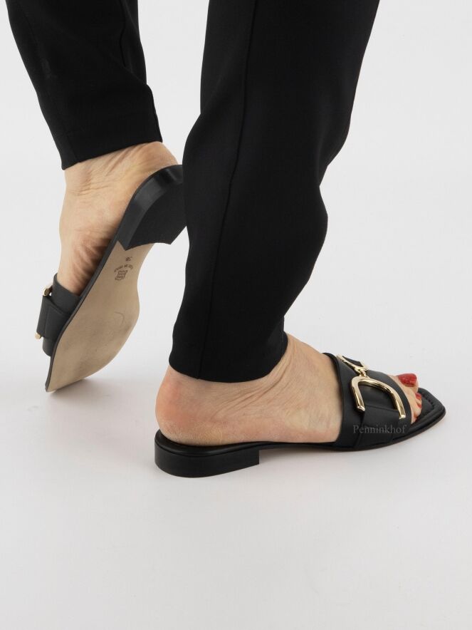Een slipper van Even and Odd (Pascucci) in zwart leder. Op de voorvoet is een goudkleurige bit Het voetbed is van leder in de kleur zwart.