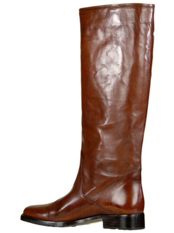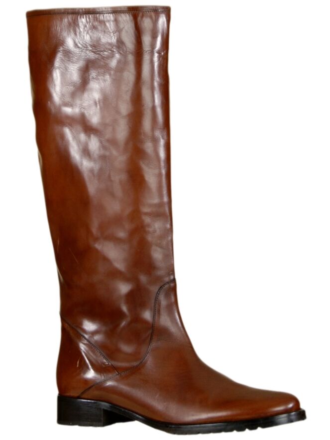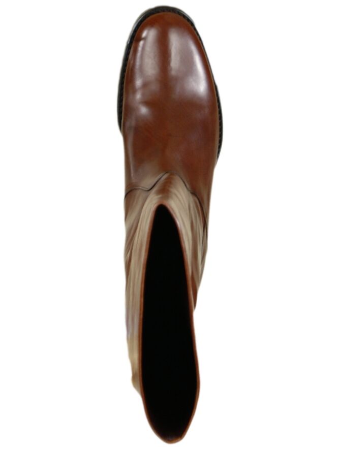 Een lederen cognac kleurige tube laars van het merk Even & Odd. De schachthoogte van de laars is 43 cm en de schachtwijdte is 40 cm. De laars heeft een kunststof zool en de binnenzijde is met leder gevoerd.