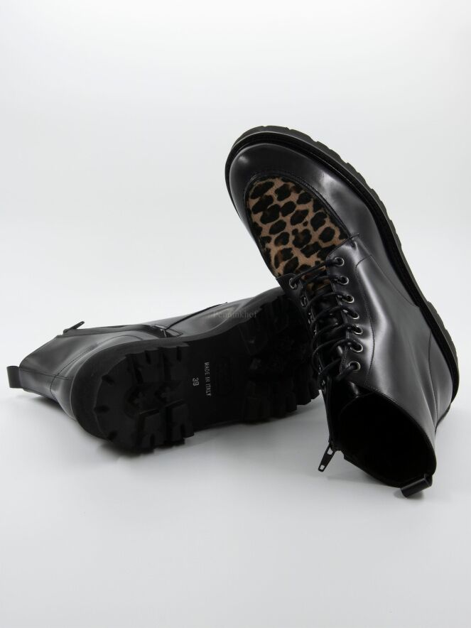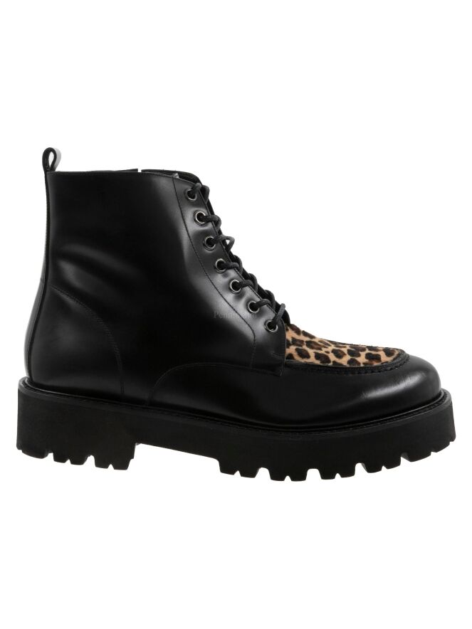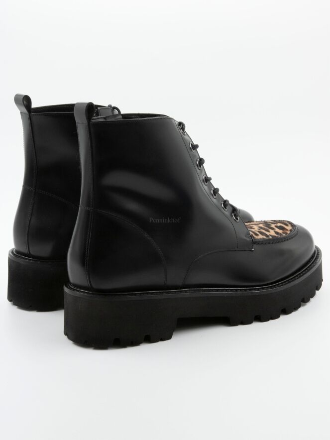 Een veter laarsje van Even and Odd (Pascucci) in een zwart leder. Op de voorvoet een geschoren ponyvacht in een luipaardprint. de zool is gekarteld en de binnenkant is met leder gevoerd.